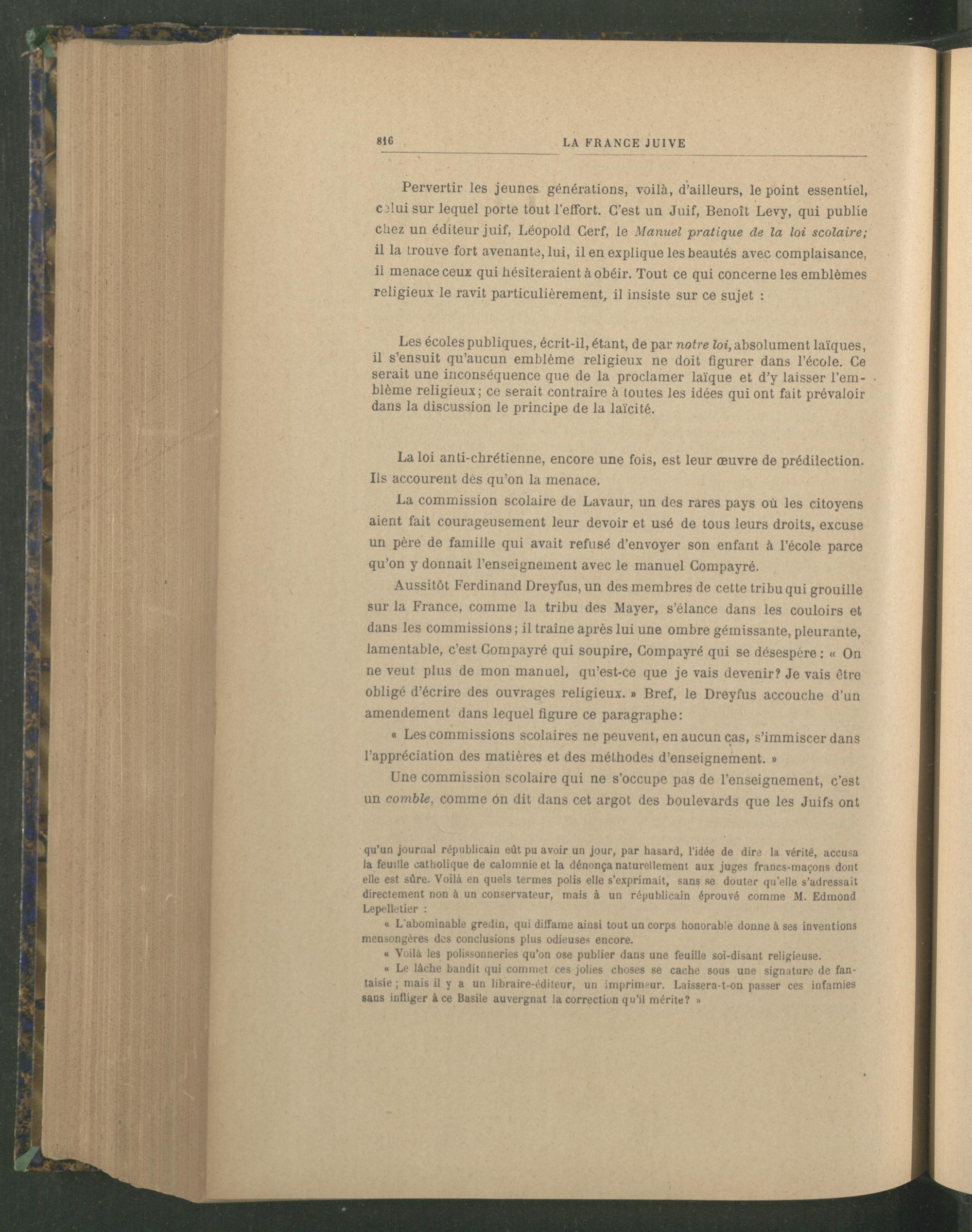 Pervertir les jeunes générations, voilà, d’ailleurs, le point essentiel, c?lui sur lequel porte tout l’effort. C’est un Juif, Benoît Levy, qui publie chez un éditeur juif , Léopold Cerf, le Manuel pratique de la loi scolaire; il la trouve fort avenante, lui, il en explique les beautés avec complaisance, il menace ceux qui hésiteraient à obéir. Tout ce qui concerne les emblèmes religieux le ravit particulièrement, il insiste sur ce sujet :
