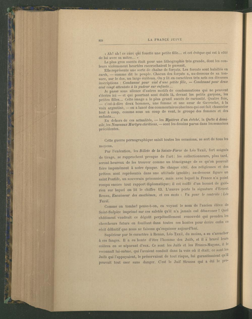 Par l’exécution, les Billets de la Sainte-Farce de Léo Taxil , fort soignés de tirage, se rapprochent presque de l’art: les collectionneurs, plus tard, seront heureux de les trouver comme un témoignage de ce qu’on pouvait faire impunément à notre époque. De chaque côté, des religieuses et des prêtres sont représentés dans une attitude ignoble; au-dessous figure un saint Pontife, un souverain prisonnier, mais avec lequel la France n'a point rompu encore tout rapport diplomatique; il est coiffé d’un bonnet de galérien sur lequel on lit le chiffre 13. L’œuvre porte la signature d’Ernest Renan , Encaisseur des anathèmes, et ces mots : Fit pour le contrôle : Léo Taxil .