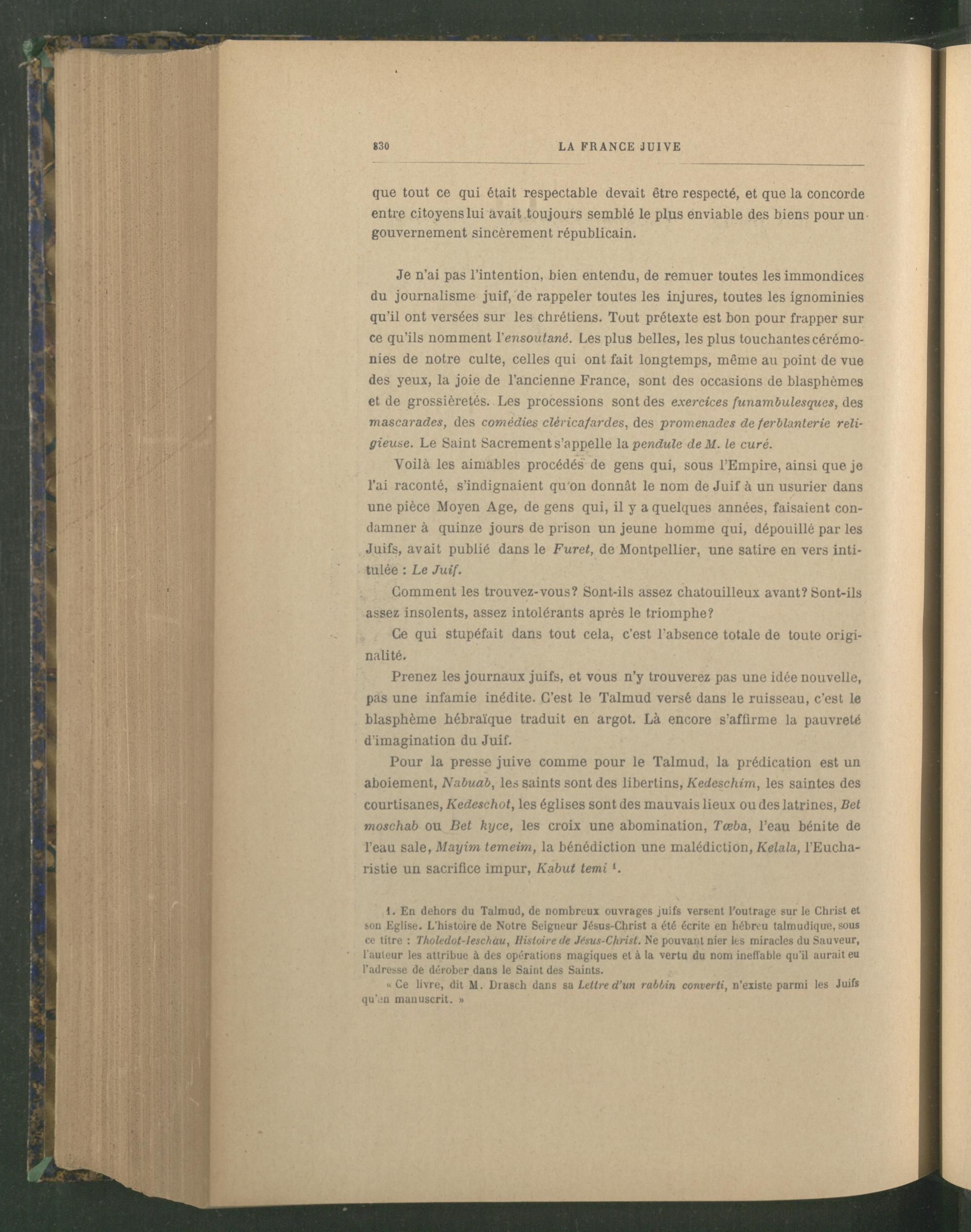 Je n’ai pas l’intention, bien entendu, de remuer toutes les immondices du journalisme juif , de rappeler toutes les injures, toutes les ignominies qu'il ont versées sur les chrétiens. Tout prétexte est bon pour frapper sur ce qu’ils nomment Y ensoutanè. Les plus belles, les plus touchantes cérémonies de notre culte, celles qui ont fait longtemps, même au point de vue des yeux, la joie de l’ancienne France , sont des occasions de blasphèmes et de grossièretés. Les processions sont des exercices funambulesques, des mascarades, des comédies cléricafardes, des promenades de ferblanterie religieuse. Le Saint Sacrement s’appelle la pendule deM. le curé.