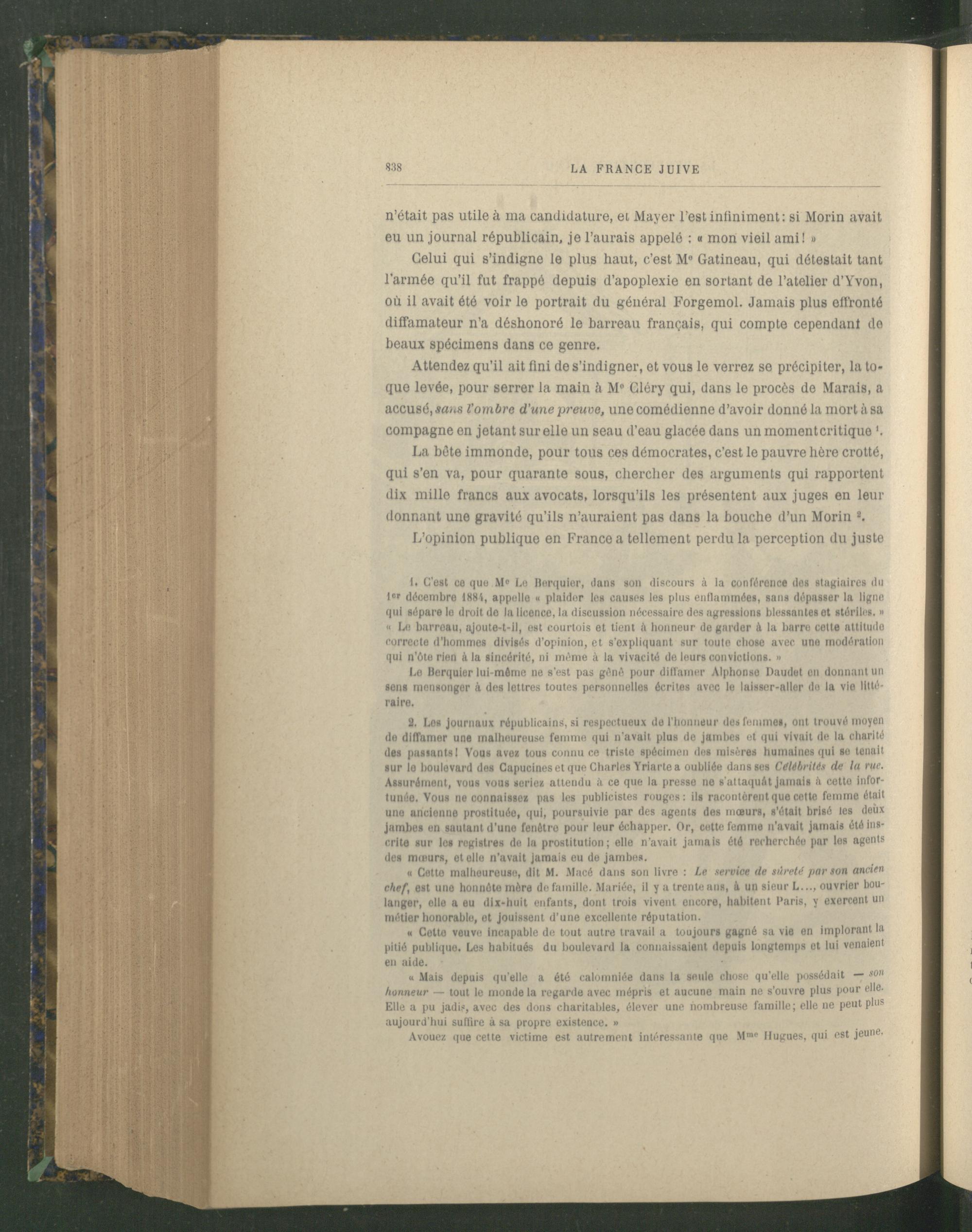 Attendez qu’il ait fini de s’indigner, et vous le verrez se précipiter, la toque levée, pour serrer la main à M° Gléry qui, dans le procès de Marais, a accusé, sans l'ombre d’une preuve, une comédienne d’avoir donné la mort à sa compagne en jetant sur elle un seau d’eau glacée dans un moment critique *.