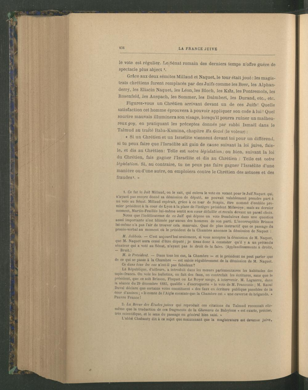 Grâce aux deux sémites Millaud et Naquet , le tour était joué : les magistrats chrétiens furent remplacés par des Juifs comme les Beer, les Alphan- derry, les Eliacin Naquet, les Léon, les Bloch, les Katz, les Pontremols, les Rosenfeld, des Anspach, les Sommer, les Dalmbert, les Durand, etc., etc.