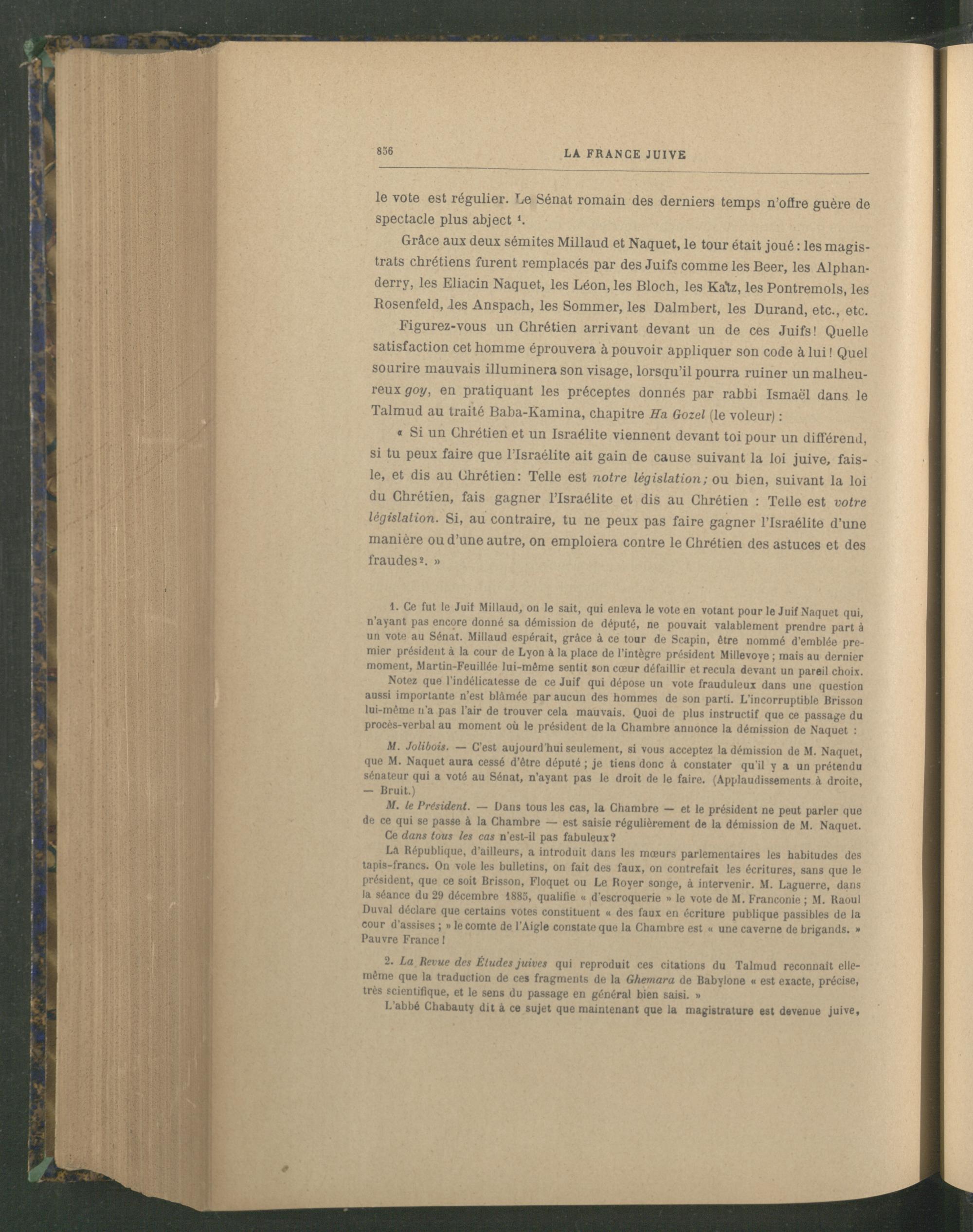 1. Ce fut le Juif Millaud, on le sait, qui enleva le vote en votant pour le Juif Naquet qui, n’ayant pas encore donné sa démission de député, ne pouvait valablement prendre part à un vote au Sénat . Millaud espérait, grâce à ce tour de Scapin, être nommé d'emblée premier président à la cour de Lyon à la place de l’intègre président Millevoye ; mais au dernier moment, Martin-Feuillée lui-même sentit son cœur défaillir et recula devant un pareil choix.