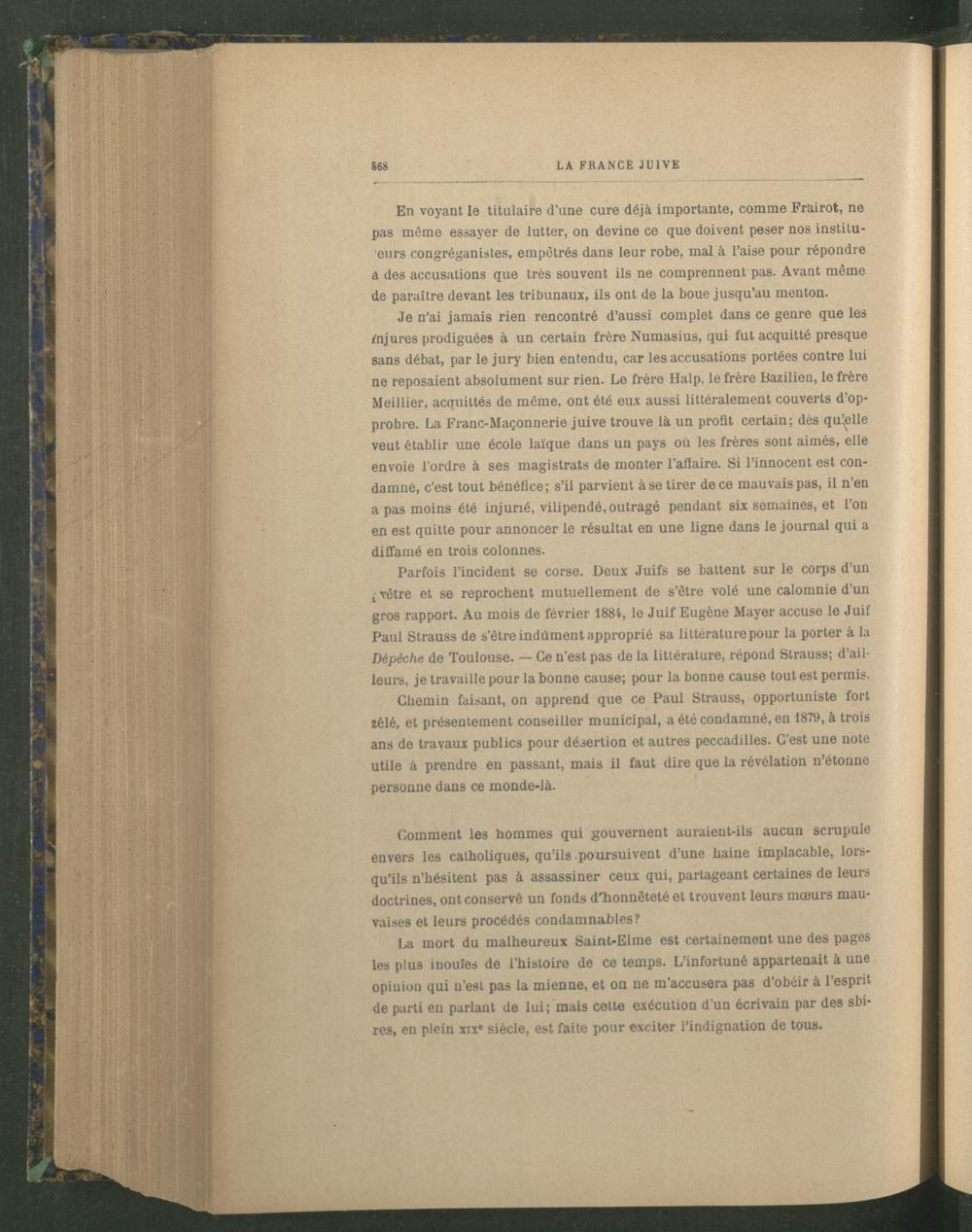 Parfois l’incident se corse. Deux Juifs se battent sur le corps d’un i vôtre et se reprochent mutuellement de s’être volé une calomnie d’un gros rapport. Au mois de février 188i, le Juif Eugène Mayer accuse le Juif Paul Strauss de s’être indûment approprié sa littérature pour la porter à la Dépêche de Toulouse . — Ce n’est pas de la littérature, répond Strauss; d’ailleurs, je travaille pour la bonne cause; pour la bonne cause tout est permis.