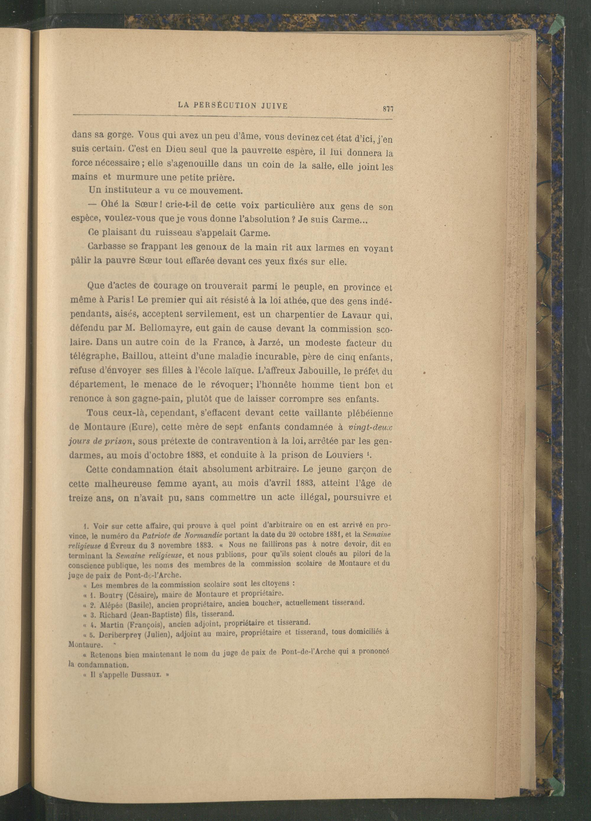 1. Voir sur cette affaire, qui prouve à quel point d’arbitraire on en est arrivé en province, le numéro du Patriote de Normandie portant la date du 20 octobre 1881, et la Semaine religieuse d Évreux du 3 novembre 1883. « Nous ne faillirons pas à notre devoir, dit en terminant la Semaine religieuse , et nous publions, pour qu ils soient cloués au pilori de la conscience publique, les noms des membres de la commission scolaire de Montaure et du juge de paix de Pont-dt-l’Arche.