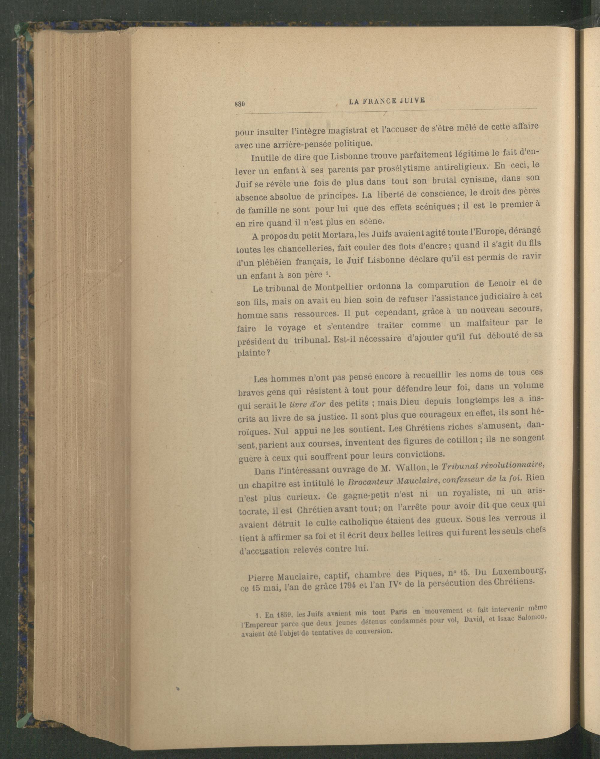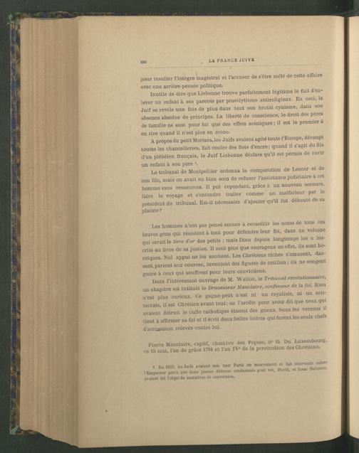 A propos du petit Mortara,les Juifs avaient agité toute l’Europe, dérangé toutes les chancelleries, fait couler des flots d’encre ; quand il s’agit du fils d’un plébéien français , le Juif Lisbonne déclare qu’il est permis de ravir un enfant à son père *.