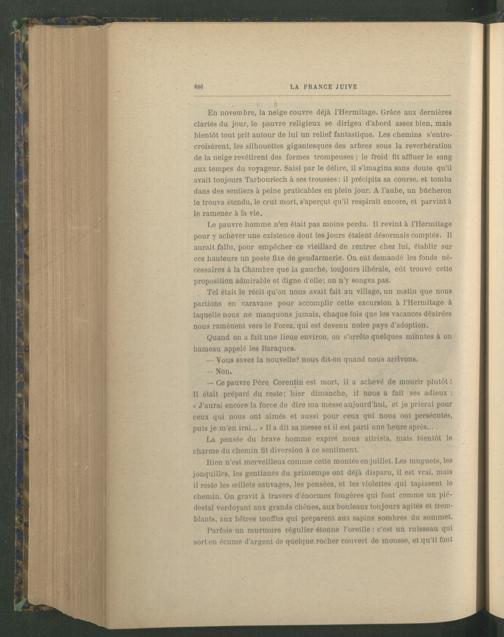 En novembre, la neige couvre déjà l’Hermitage. Grâce aux dernières clartés du jour, le pauvre religieux se dirigea d’abord assez bien, mais bientôt tout prit autour de lui un relief fantastique. Les chemins s’entrecroisèrent, les silhouettes gigantesques des arbres sous la reverbération de la neige revêtirent des formes trompeuses ; le froid fit affluer le sang aux tempes du voyageur. Saisi par le délire, il s'imagina sans doute qu’il avait toujours Tarbouriech à ses trousses : il précipita sa course, et tomba dans des sentiers à peine praticables en plein jour. A l'aube, un bûcheron le trouva étendu, le crut mort, s’aperçut qu’il respirait encore, et parvint à le ramener à la vie.