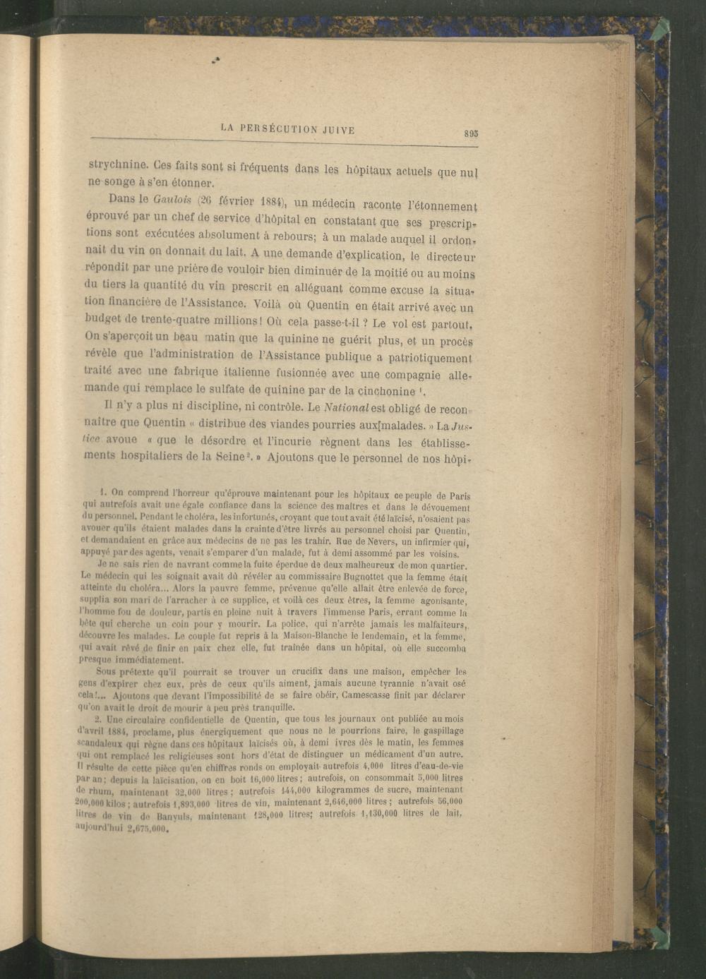 J. Une circulaire confidentielle de Quentin, que tous les journaux ont publiée au mois d’avril 1884, proclame, plus énergiquement que nous ne le pourrions faire, le gaspillage scandaleux qui règne dans ces hôpitaux laïcisés où, à demi ivres dès le matin, les femmes «lui ont remplacé les religieuses sont hors d’état de distinguer un médicament d’un autre.