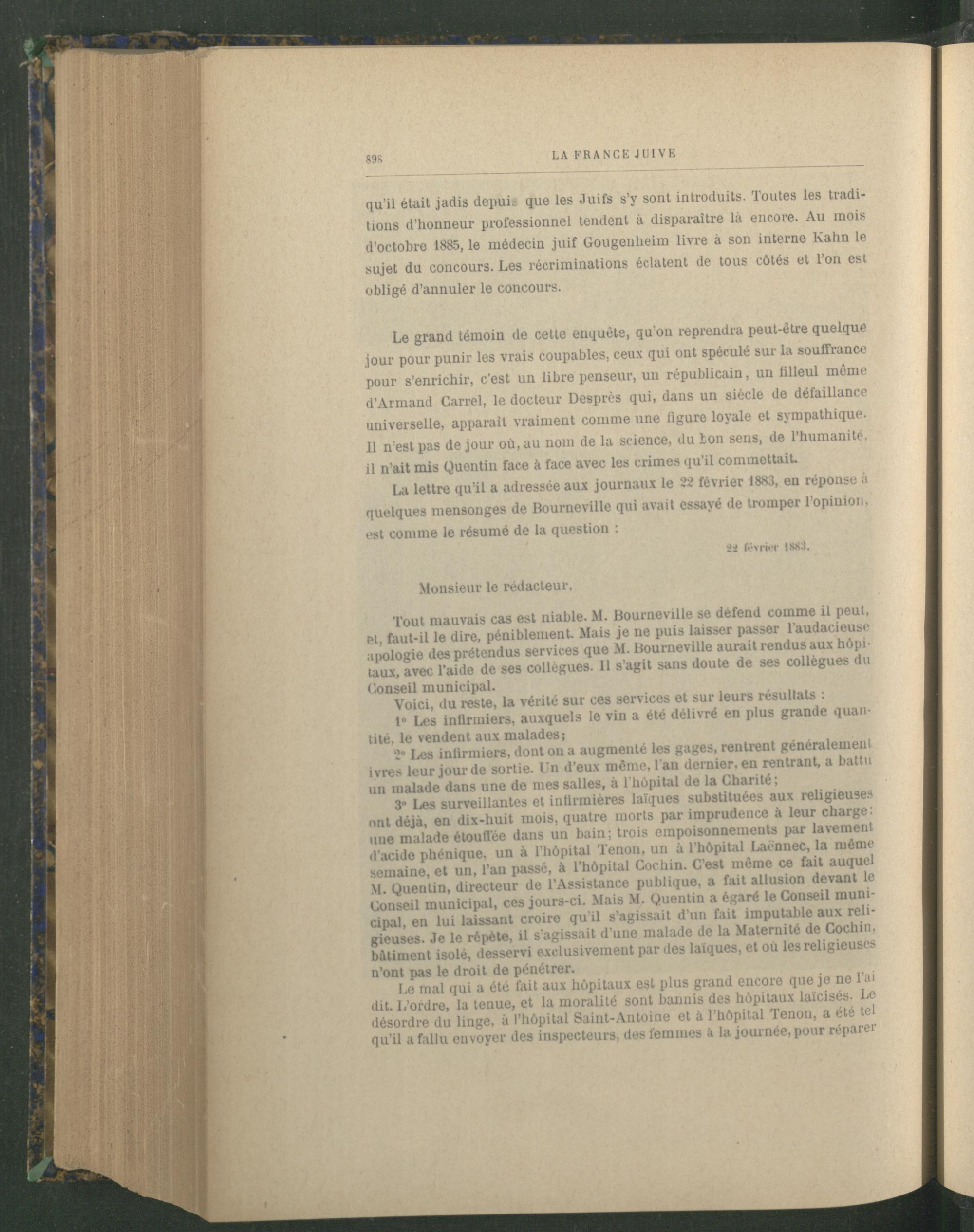 qu’il était jadis depuis que les Juifs s’y sont introduits. Toutes les traditions d’honneur professionnel tendent à disparaître là encore. Au mois d’octobre 1885, le médecin juif Gougeuheim livre à son interne Kahn le sujet du concours. Les récriminations éclatent de tous côtés et l’on est obligé d’annuler le concours.