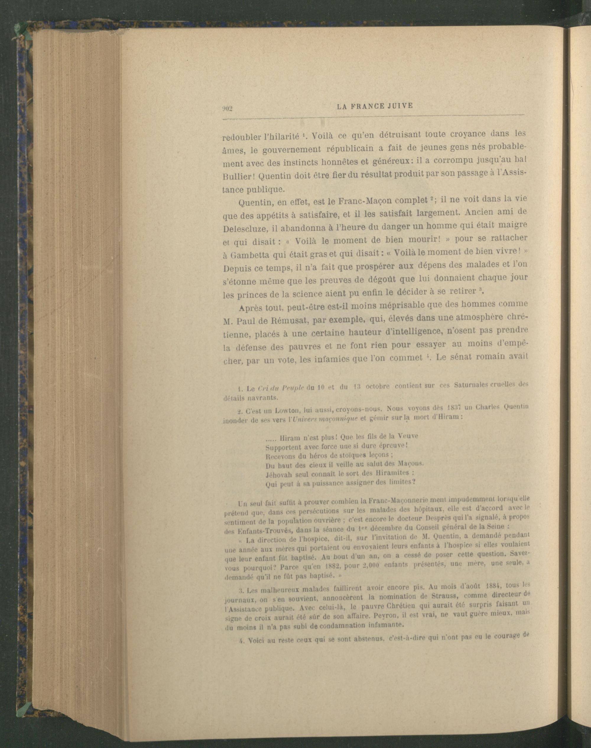 Quentin, en effet, est le Franc-Maçon complet *; il ne voit dans la vie que des appétits à satisfaire, et il les satisfait largement. Ancien ami de Delescluze , il abandonna à l’heure du danger un homme qui était maigre et qui disait : « Voilà le moment de bien mourir! » pour se rattacher à Gambetta qui était gras et qui disait : « Voilà le moment de bien vivre! » Depuis ce temps, il n’a fait que prospérer aux dépens des malades et l’on s’étonne même que les preuves de dégoût que lui donnaient chaque jour les princes de la science aient pu enfin le décider à se retirer \