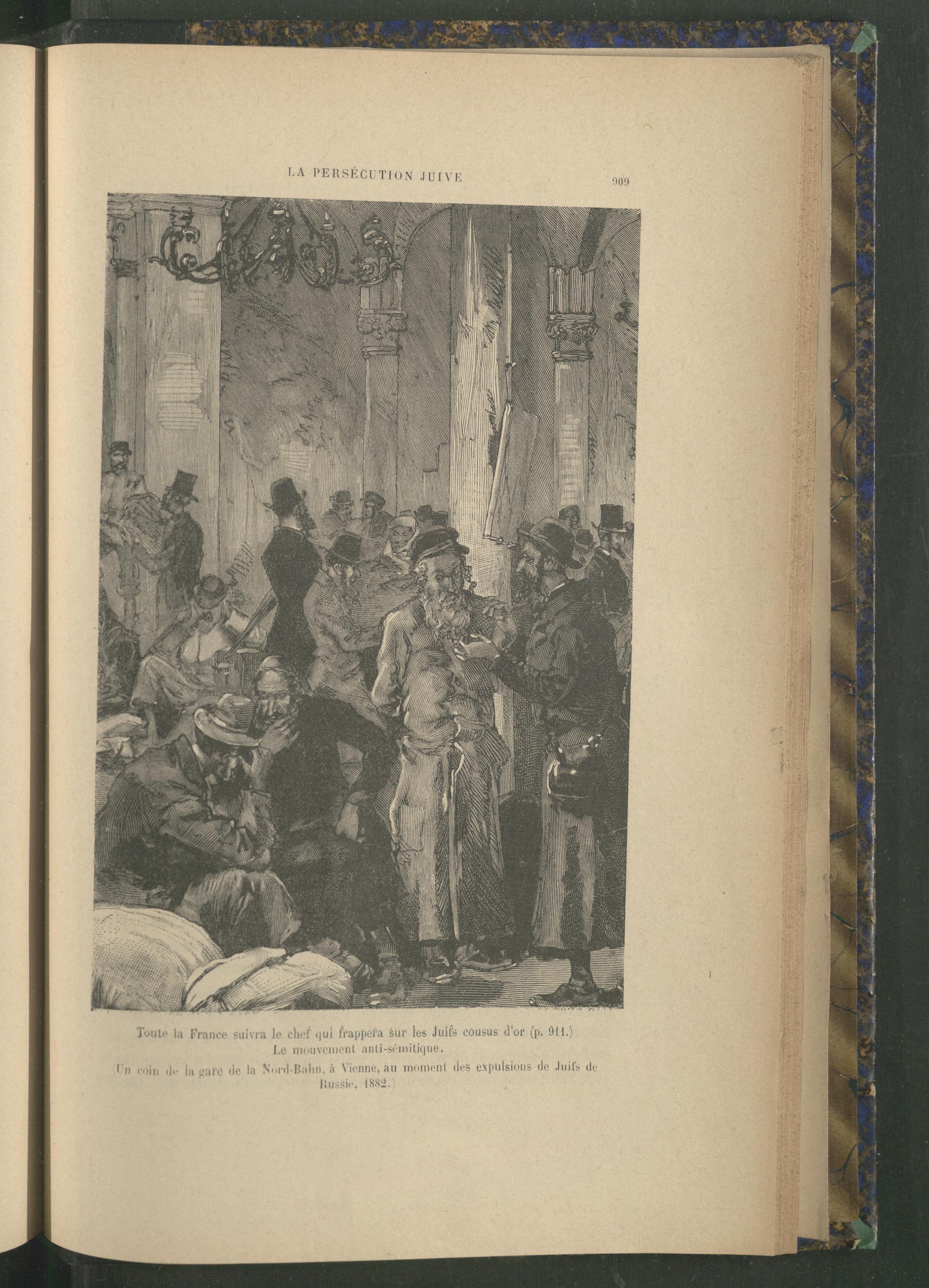 LA PERSECUTION JUIVE 909 Toute la France suivra le chef qui frappera sur les Juifs cousus d'or( p. 911.) Le mouvement anti- sémitique. ( Un coin de la gare de la Nord- Bahn, à Vienne , au moment des expulsions de Juifs de Russie , 1882.)