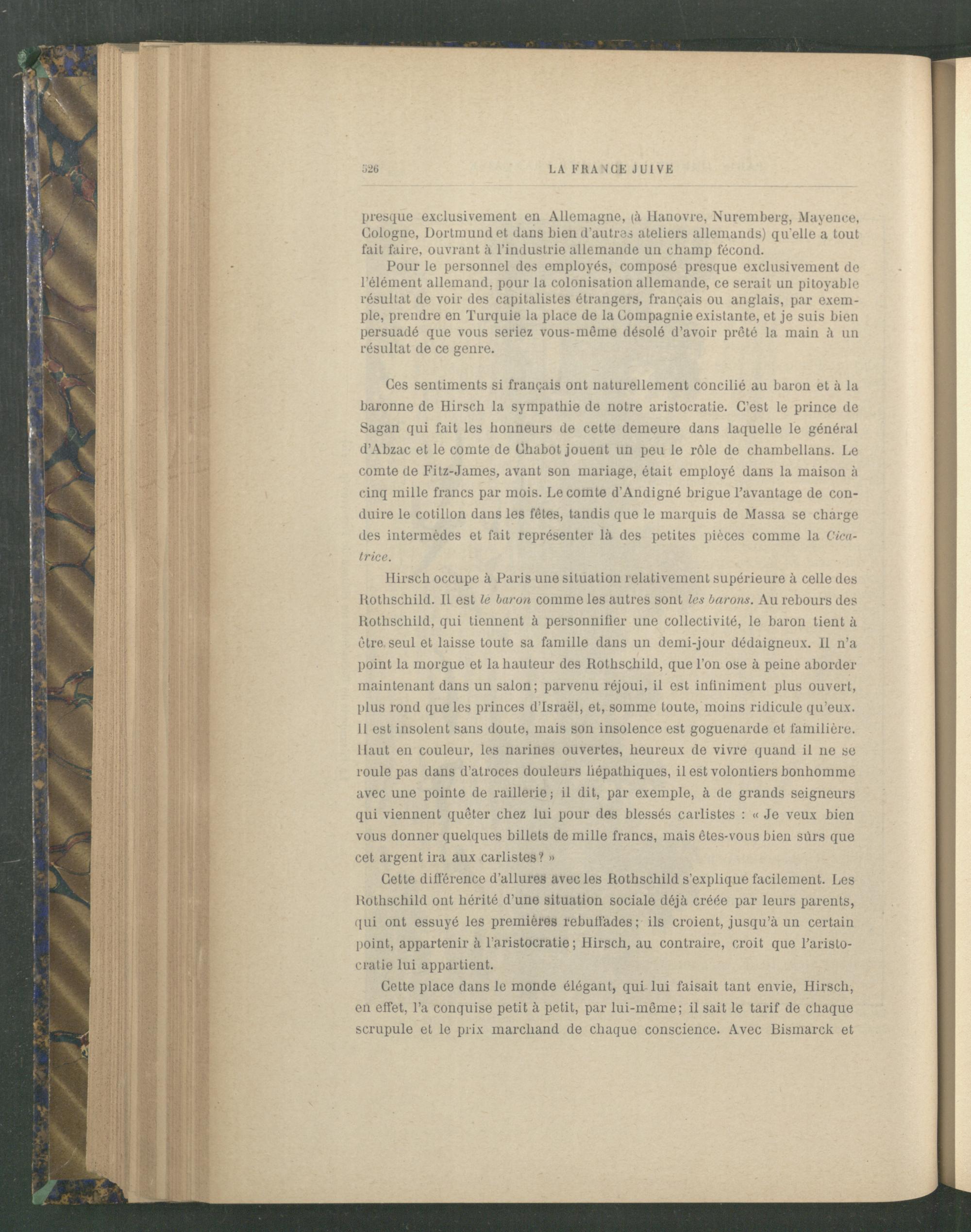 Cette différence d’allure3 avec les Rothschild s'explique facilement. Les Rothschild ont hérité d’une situation sociale déjà créée par leurs parents, qui ont essuyé les premières rebuffades; ils croient, jusqu’à un certain point, appartenir à l'aristocratie ; Hirsch, au contraire, croit que l’aristocratie lui appartient.