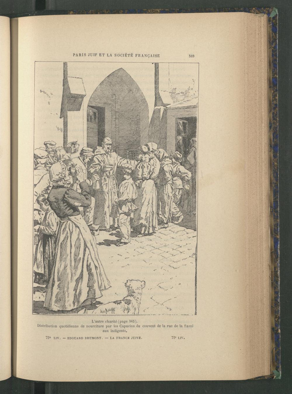 PARIS JUIF ET LA SOCIÉTÉ FRANÇAISE 569 a « a V L’autre charité (page 565). Distribution quotidienne de nourriture par les Capucins du couvent de la rue de la Santé aux indigents. 72° Ltv. — EDOUARD DRUMONT . — LA FRANCE JUIVE. 72 e LIY.