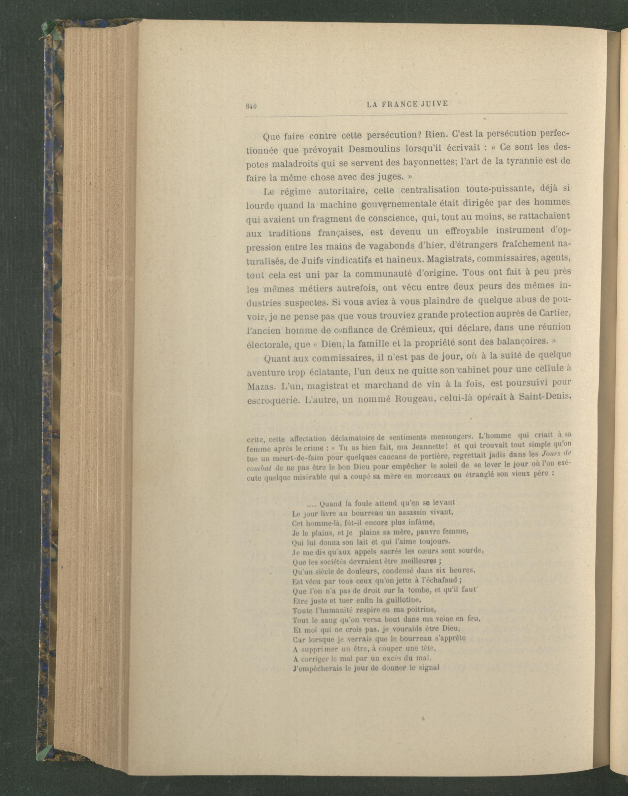 Iæ régime autoritaire, cette centralisation toute-puissante, déjà si lourde quand la machine gouvernementale était dirigée par des hommes qui avaient un fragment de conscience, qui, tout au moins, se rattachaient aux traditions françaises, est devenu un effroyable instrument d’oppression entre les mains de vagabonds d’hier, d’étrangers fraîchement naturalisés, de Juifs vindicatifs et haineux. Magistrats, commissaires, agents, tout cela est uni par la communauté d’origine. Tous ont fait à peu près les mêmes métiers autrefois, ont vécu entre deux peurs des mêmes industries suspectes. Si vous aviez à vous plaindre de quelque abus de pouvoir, je ne pense pas que vous trouviez grande protection auprès de Cartier, l’ancien homme de confiance de Crémieux, qui déclare, dans une réunion électorale, que « Dieu , la famille et la propriété sont des balançoires. » Quant aux commissaires, il n’est pas de jour, où à la suité de quelque aventure trop éclatante, l’un deux ne quitte son cabinet pour une cellule à Mazas. L’un, magistrat et marchand de vin à la fois, est poursuivi pour escroquerie. L’autre, un nommé Rougeau, celui-là opérait à Saint-Denis ,