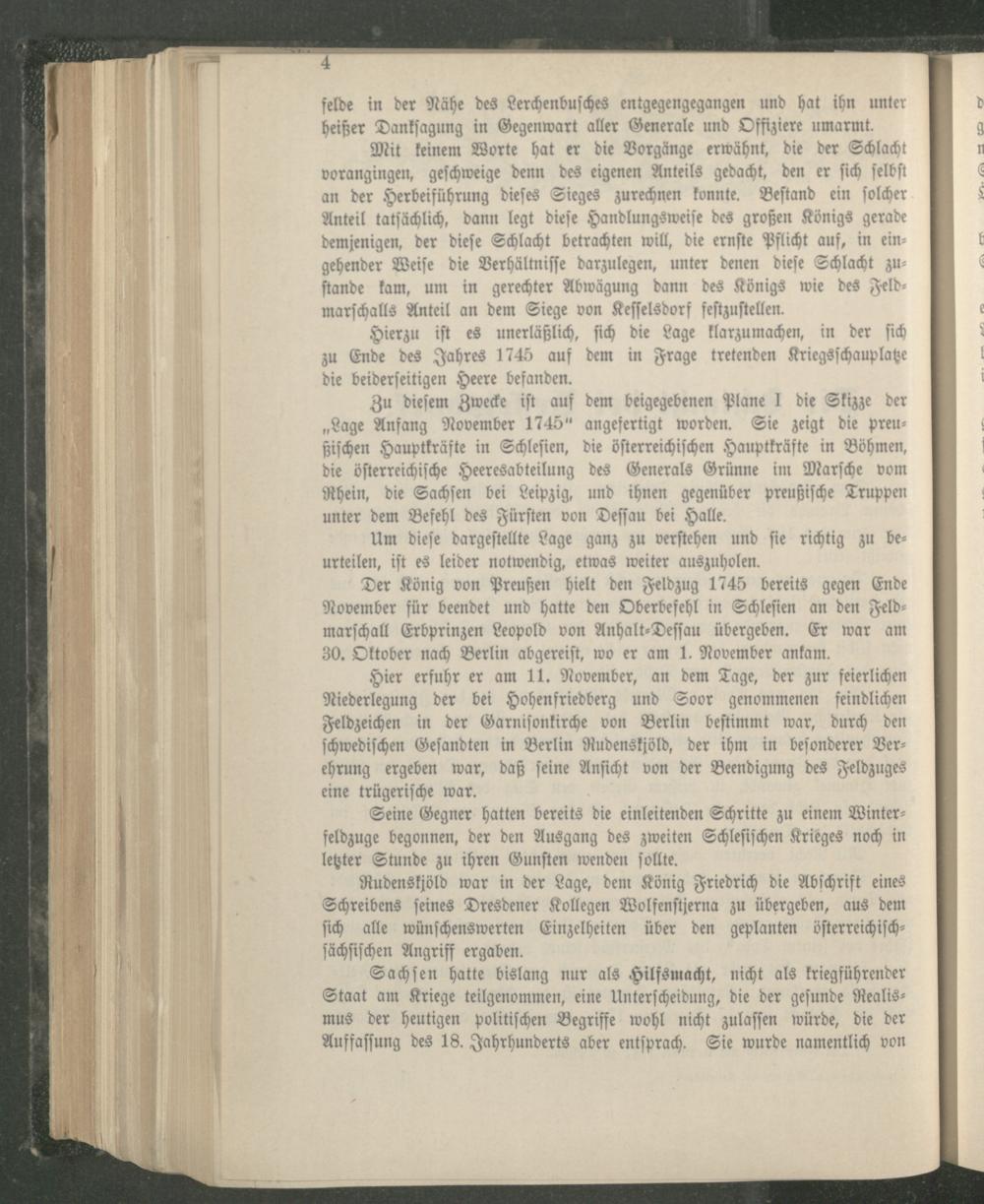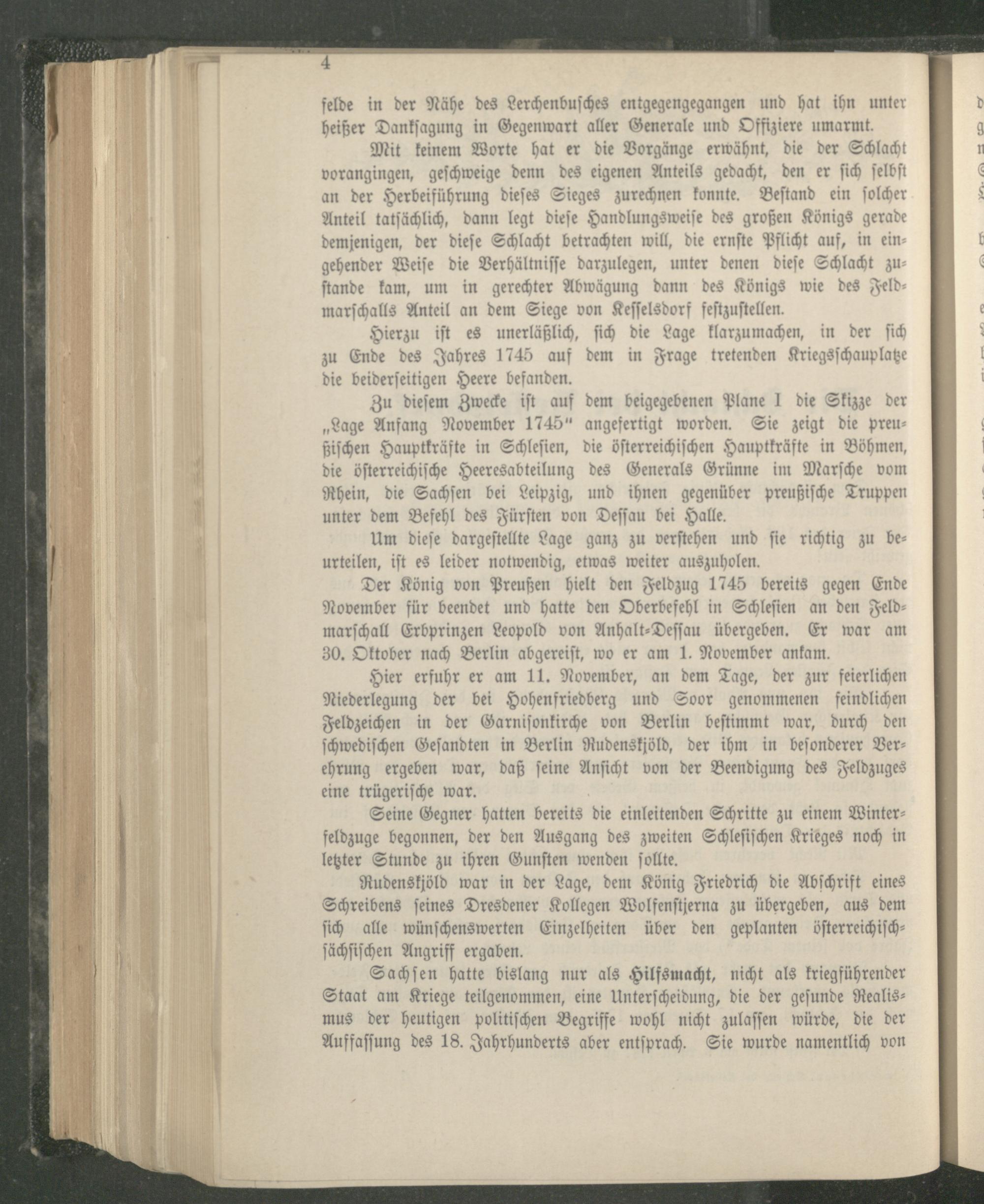 Mit keinem Worte hat er die Vorgänge erwähnt, die der Schlacht vorangingen, geſchweige denn des eigenen Anteils gedacht, den er ſich ſelbſt an der Herbeiführung dieſes Sieges zurechnen konnte. Beſtand ein ſolcher Anteil tatſächlich, dann legt dieſe Handlungsweiſe des großen Königs gerade demjenigen, der dieſe Schlacht betrachten will, die ernſte Pflicht auf, in ein gehender Weiſe die Verhältniſſe darzulegen, unter denen dieſe Schlacht zu ſtande kam, um in gerechter Abwägung dann des Königs wie des Feld marſchalls Anteil an dem Siege von Keſſelsdorf feſtzuſtellen.