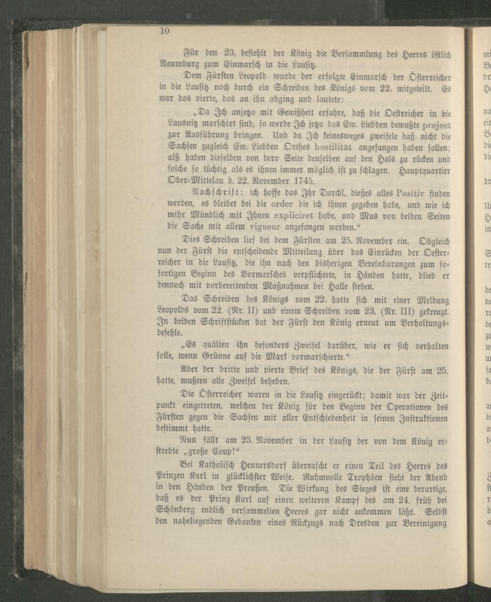 Ich anjetzo mit Gewißheit erfahre, daß die Oeſtreicher in die Laus nie ö ſind, ſo werde Ich jetzo das Ew. Liebden bewußte project zur Ausführung bringe n. Und da Ich=/. zweifele daß nicht die Sachſen zugleich Ew. Liebden Orthes hostilität angefangen haben ſollen; alß haben dieſelben von dero Seite denſelben auf den Hals zu rücken und ſolche ſo tüchtig als es ihnen immer möglich iſt zu ſchlagen. Hauptquartier Ober⸗Mittelau d. 22. November 1745.