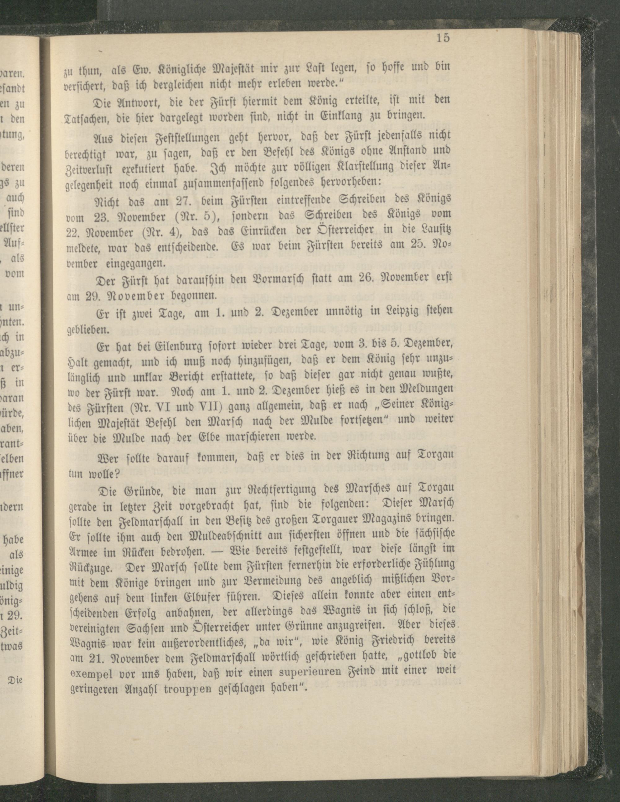 Er hat bei Eilenburg ſofort wieder drei Tage, vom 3. bis 5. Dezember, Halt gemacht, und ich muß noch hinzufügen, daß er dem König ſehr unzulänglich und unklar Bericht erſtattete, ſo daß dieſer gar nicht genau wußte, wo der Fürſt war. Noch am 1. und 2. Dezember hieß es in den Meldungen