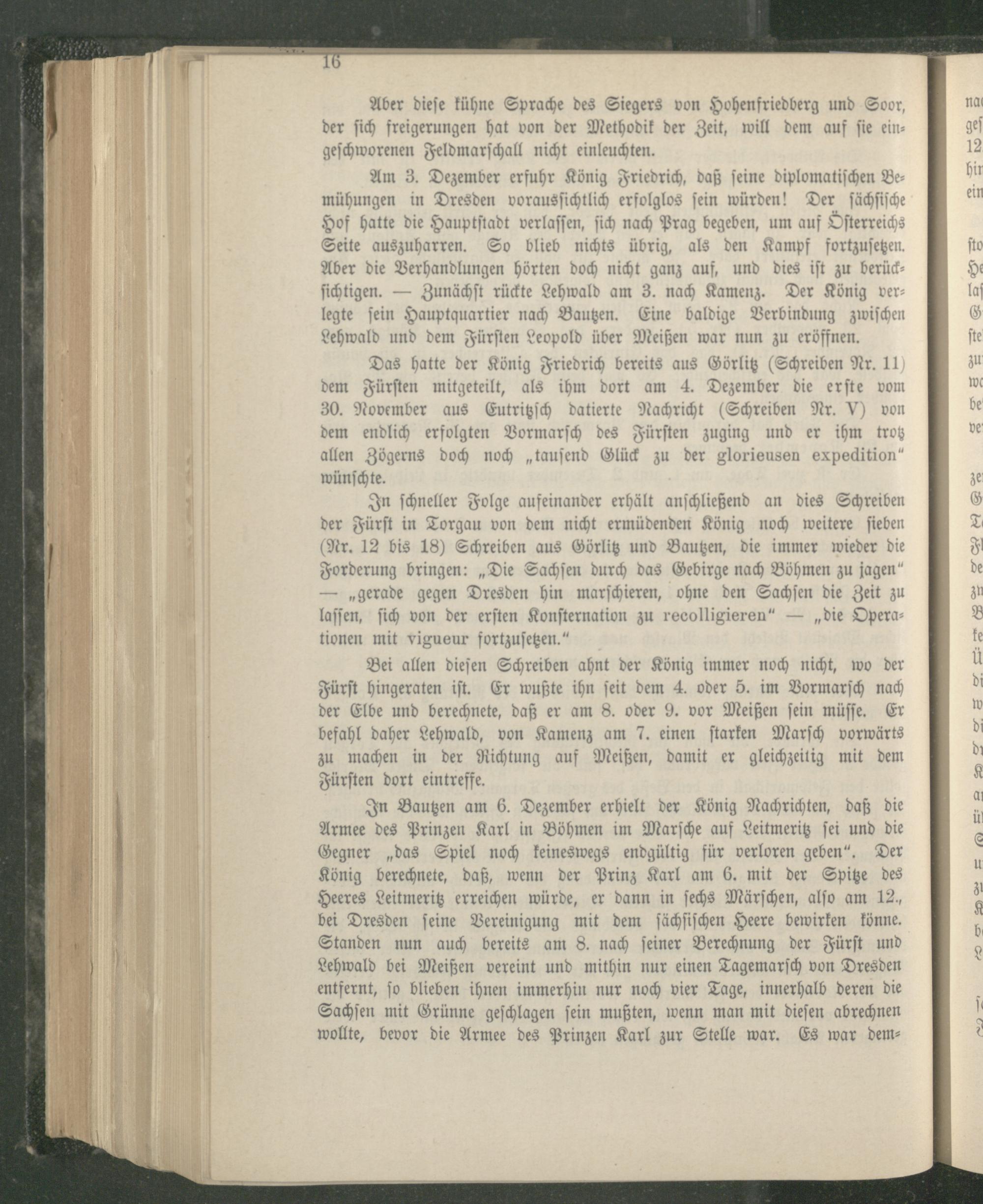 In ſchneller Folge aufeinander erhält anſchließend an dies Schreiben der Fürſt in Torgau von dem nicht ermüdenden König noch weitere ſieben (Nr. 12 bis 18) Schreiben aus Görlitz und Bautzen, die immer wieder die Forderung bringen:„Die Sachſen durch das Gebirge nach Böhmen zu jagen“