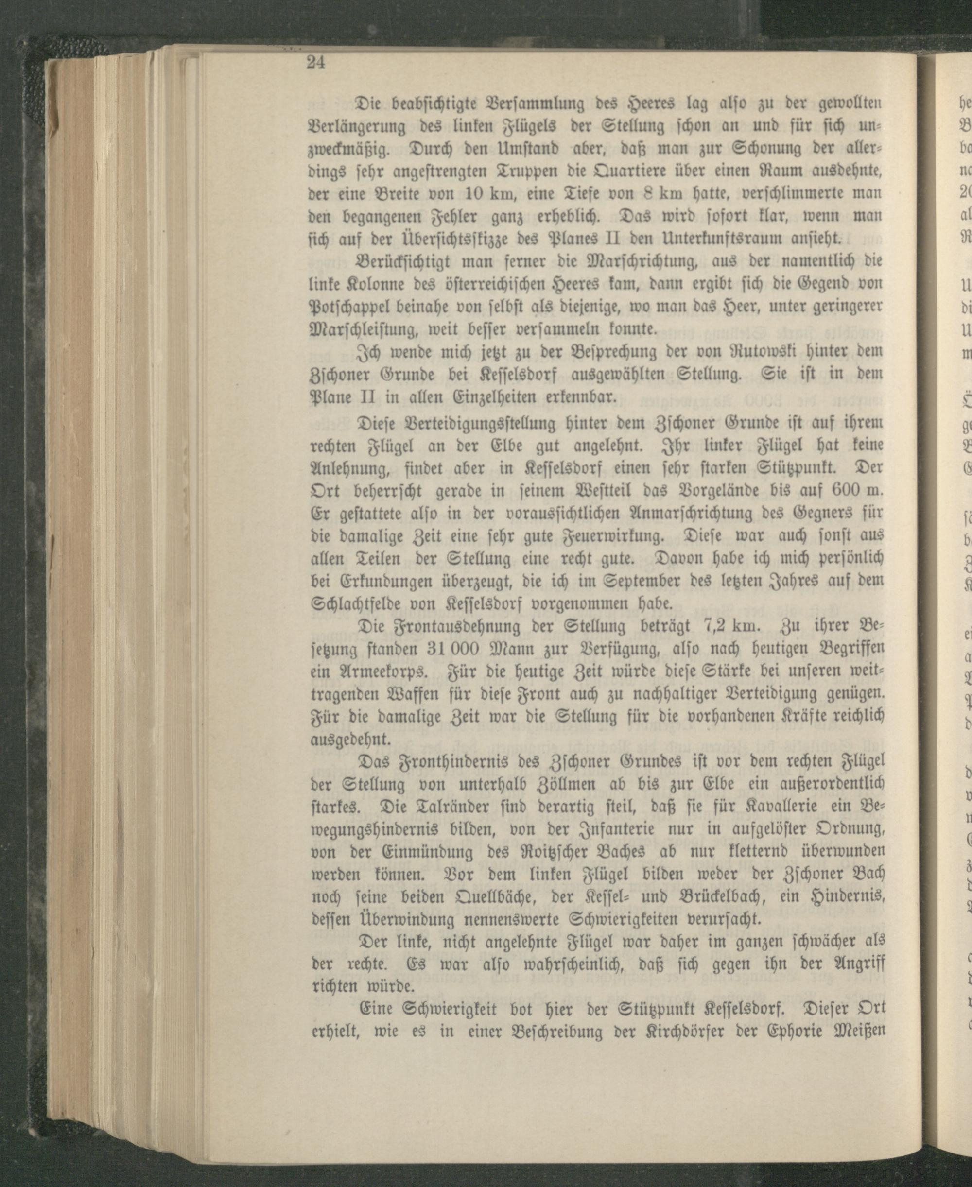 Dieſe Verteidigungsſtellung hinter dem Iſchoner Grunde iſt auf ihrem rechten Flügel an der Elbe gut angelehnt. Ihr linker Flügel hat keine Anlehnung, findet aber in Keſſelsdorf einen ſehr ſtarken Stützpunkt. Der Ort beherrſcht gerade in ſeinem Weſtteil das Vorgelände bis auf 600 m. Er geſtattete alſo in der vorausſichtlichen Anmarſchrichtung des Gegners für die damalige Zeit eine ſehr gute Feuerwirkung. Dieſe war auch ſonſt aus allen Teilen der Stellung eine recht gute. Davon habe ich mich perſönlich bei Erkundungen überzeugt, die ich im September des letzten Jahres auf dem Schlachtfelde von Keſſelsdorf vorgenommen habe.