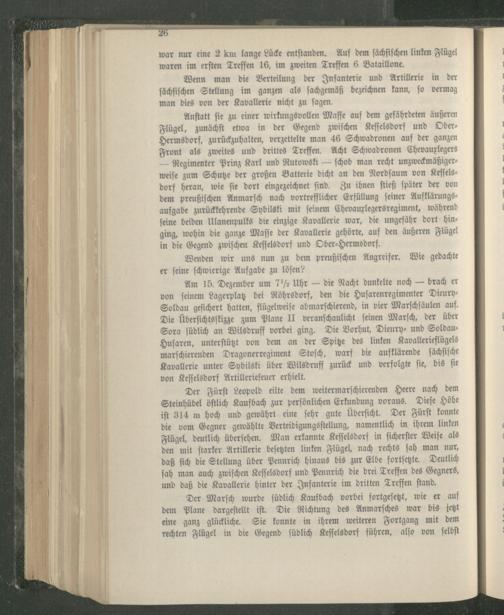 Regimenter Prinz Karl und Rutowski ſchob man recht unzweckmäßigerweiſe zum Schutze der großen Batterie dicht an den Nordſaum von Keſſels dorf heran, wie ſie dort eingezeichnet ſind. Zu ihnen ſtieß ſpäter der von dem preußiſchen Anmarſch nach vortrefflicher Erfüllung ſeiner Aufklärungsaufgabe zurückkehrende Sybilski mit ſeinem Chevauxlegersregiment, während ſeine beiden Ulanenpulks die einzige Kavallerie war, die ungefähr dort hinging, wohin die ganze Maſſe der Kavallerie gehörte, auf den äußeren Flügel in die Gegend zwiſchen Keſſelsdorf und Ober⸗Hermedorf.