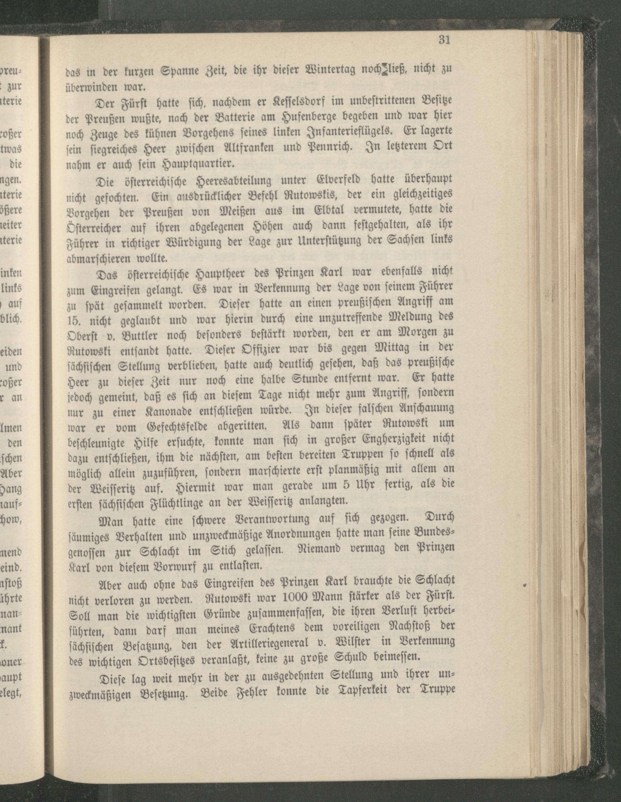 Aber auch ohne das Eingreifen des Prinzen Karl brauchte die Schlacht nicht verloren zu werden. Rutowski war 1000 Mann ſtärker als der Fürſt. Soll man die wichtigſten Gründe zuſammenfaͤſſen, die ihren Verluſt herbeiführten, dann darf man meines Erachtens dem voreiligen Nachſtoß der ſächſiſchen Beſatzung, den der Artilleriegeneral v. Wilſter in Verkennung des wichtigen Ortsbeſitzes veranlaßt, keine zu große Schuld beimeſſen.