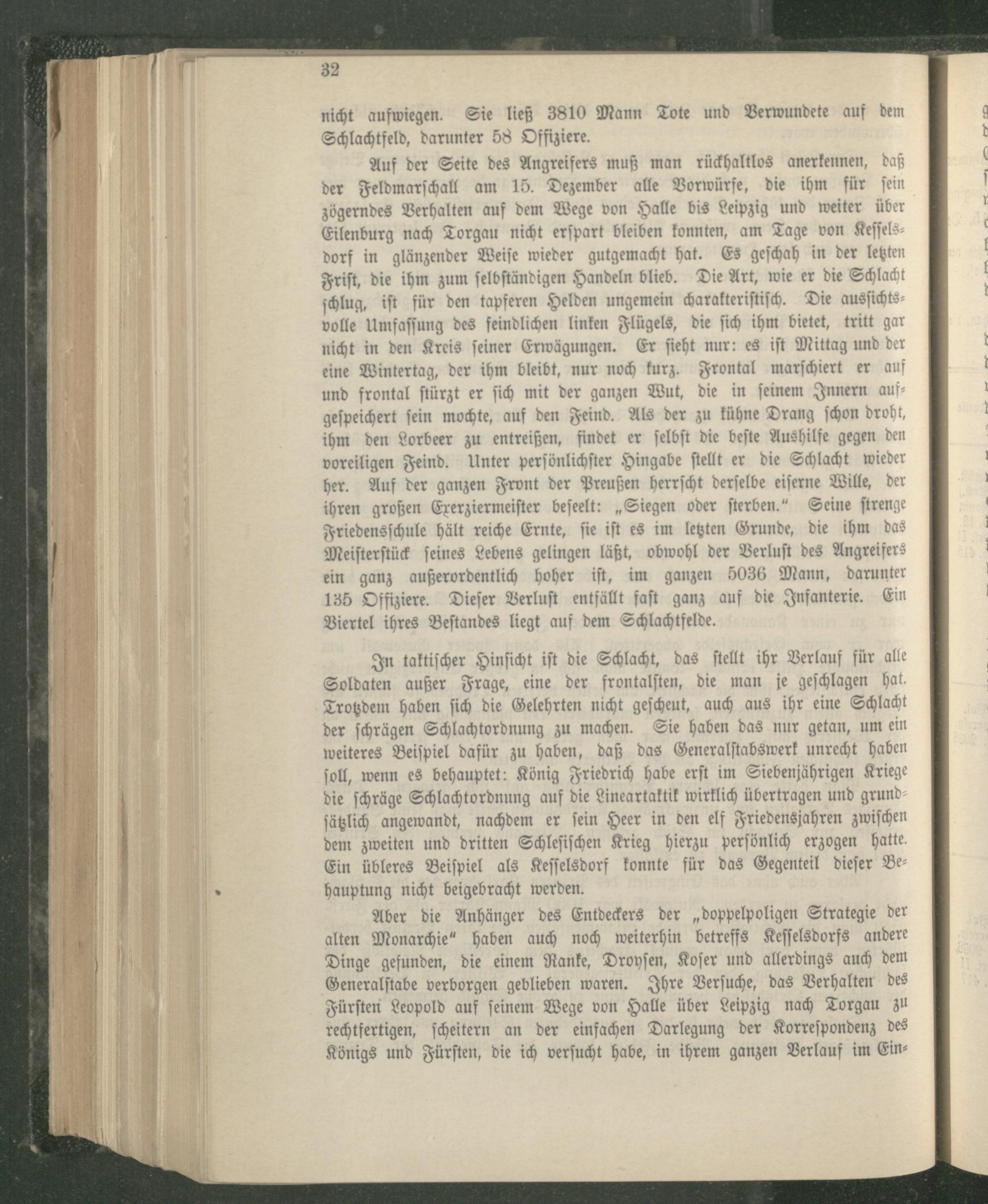 In taktiſcher Hinſicht iſt die Schlacht, das ſtellt ihr Verlauf für alle Soldaten außer Frage, eine der frontalſten, die man je geſchlagen hat. Trotzdem haben ſich die Gelehrten nicht geſcheut, auch aus ihr eine Schlacht der ſchrägen Schlachtordnung zu machen. Sie haben das nur getan, um ein weiteres Beiſpiel dafür zu haben, daß das Generalſtabswerk unrecht haben ſoll, wenn es behauptet: König Friedrich habe erſt im Siebenjährigen Kriege die ſchräge Schlachtordnung auf die Lineartaktik wirklich übertragen und grund ſätzlich angewandt, nachdem er ſein Heer in den elf Friedensjahren zwiſchen dem zweiten und dritten Schleſiſchen Krieg hierzu perſönlich erzogen hatte. Ein übleres Beiſpiel als Keſſelsdorf konnte für das Gegenteil dieſer Be— hauptung nicht beigebracht werden.