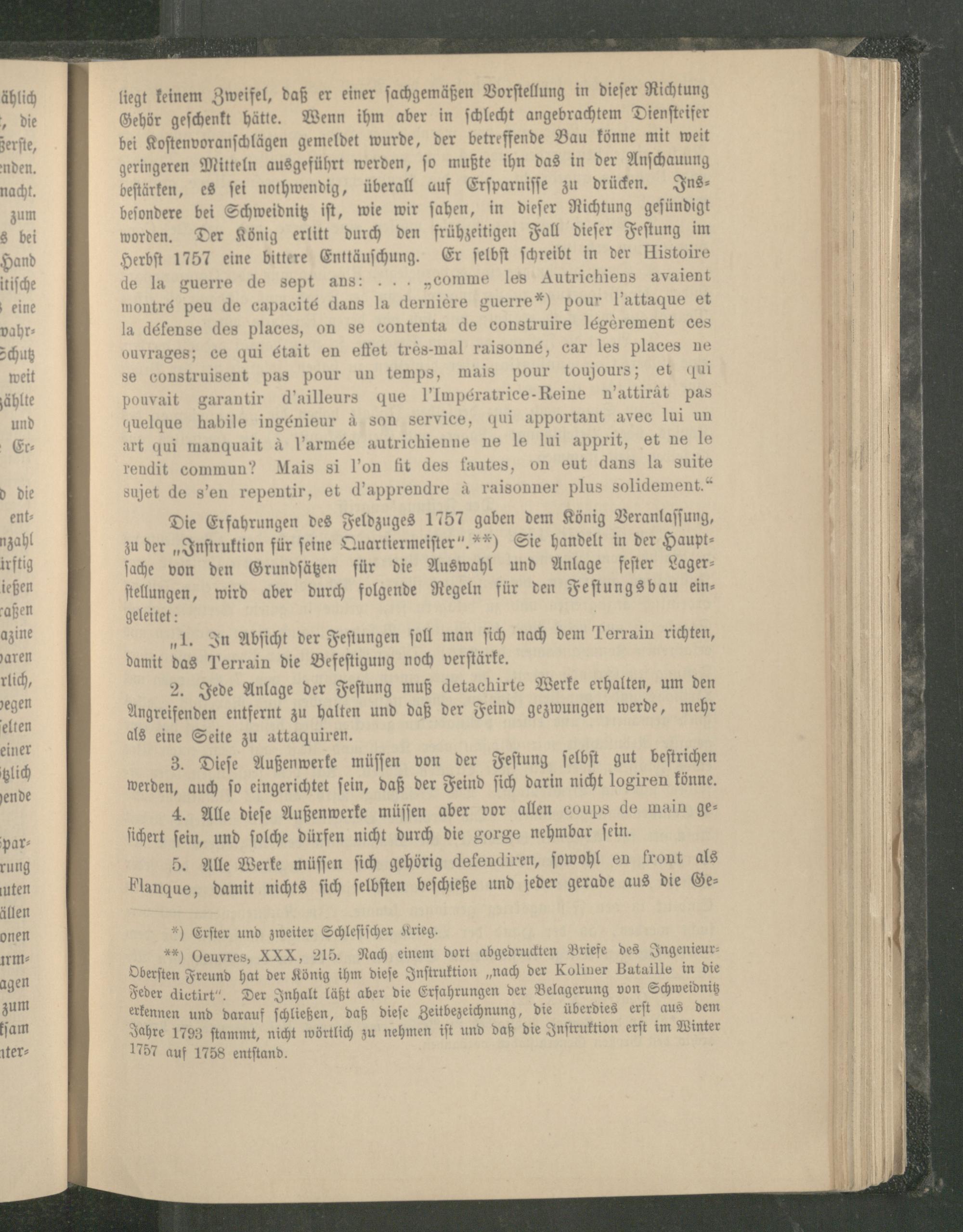 liegt keinem Zweifel, daß er einer ſachgemäßen Vorſtellung in dieſer Richtung Gehör geſchenkt hätte. Wenn ihm aber in ſchlecht angebrachtem Dienſteifer bei Koſtenvoranſchlägen gemeldet wurde, der betreffende Bau könne mit weit geringeren Mitteln ausgeführt werden, ſo mußte ihn das in der Anſchauung beſtärken, es ſei nothwendig, überall auf Erſparniſſe zu drücken. Insbeſondere bei Schweidnitz iſt, wie wir ſahen, in dieſer Richtung geſündigt worden. Der König erlitt durch den frühzeitigen Fall dieſer Feſtung im Herbſt 1757 eine bittere Enttäuſchung. Er ſelbſt ſchreibt in der Histoire de la guerre de sept ans:..„comme les Autrichiens avaient
