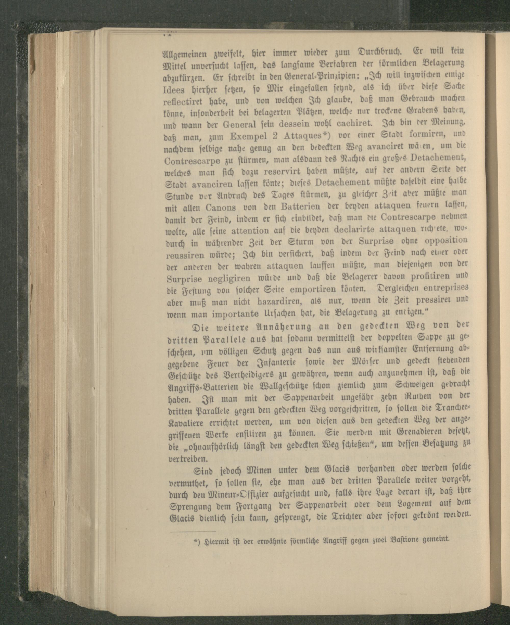 Allgemeinen zweifelt, hier immer wieder zum Durchbruch. Er will kein Mittel unverſucht laſſen, das langſame Verfahren der förmlichen Belagerung abzukürzen. Er ſchreibt in den General⸗-Prinzipien:„Ich will inzwiſchen emige dees hierher ſetzen, jo Mir eingefallen ſeynd, als ich über dieſe Sache reflectiret habe, und von welchen Ich glaube, daß man Gebrauch machen könne, inſonderbeit bei belagerten Plätzen, welche nur trockene Grabens haben und wann der General ſein dessein wohl cachiret. Ich bin der Meinung, daß man, zum Exempel 2 Attaques”) vor einer Stadt formiren, und nachdem ſelbige nahe genug an den bedeckten Weg avanciret wälen, um di Contrescarpe zu ſtürmen, man alsdann des Nachts ein großes Detachement, welches man ſich dazu reservirt haben müßte, auf der andern Seite der Stadt avanciren laſſen könte; dieſes Detachement müßte daſelbſt eine halbe Stunde vor Anbruch des Tages ſtürmen, zu gleicher Zrit aber müßte man mit allen Canons von den Batterien der beyden attaquen feuern laſſen, damit der Feind, indem er ſich einbildet, daß man die Contrescarpe nehmen wolte, alle ſeine attention auf die beyden declarirte attaquen richtete, wo durch in währender Zeit der Sturm von der Surprise ohne opposition reussiren würde; Ich bin verſichert, daß indem der Feind nach einer oder der anderen der wahren attaquen lauffen müßte, man diejenigen von der