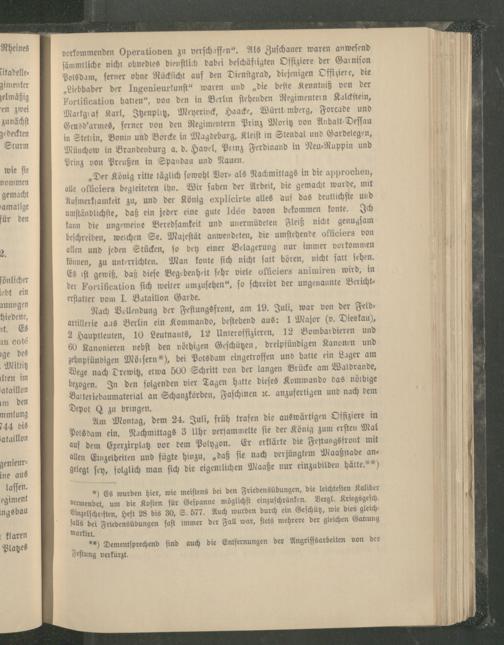 Am Montag, dem 24. Juli, früh trafen die auswärtigen Offiziere in Potsdam ein. Nachmittags 3 Uhr verſammelte ſie der König zum erſten Mal auf dem Exerzirplatz vor dem Polygon. Er erklärte die Feſtungsfront mit allen Einzelheiten und fügte hinzu,„daß fie nach verjüngtem Maaßnabe angelegt ſey, folglich man ſich die eigentlichen Maaße nur einzubilden hätte.“)