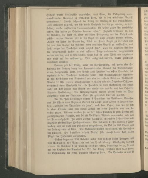 Hierauf wurde hinlänglich angewießen, was Einer, die Belagerung eom— mandirender General zu beobachten hätte, ehe er den würklichen Angriff unternimmt.“ Ebenſo beſprach der König die Maßregeln des Vertheidigers, „und erwähnte zugleich, um ſich durch Beyſpiele deutlich zu machen, mehrere Fehler, welche verſchiedene Commandanten, die Plätze gegen ihn vertheidigt hatten, ſich hatten zu Schulden kommen laſſen.“ Zugleich beſtimmte er, daß die Arbeiten, die ſonſt bei einer wirklichen Belagerung nur des Nachts aus geführt werden könnten, hier in der Regel bei Tage gemacht werden wurden, „damit ein Jeder im Stande ſey, Alles mit ſeinen Augen zu überſehen und ſich von dem Gange der Arbeiten einen deutlichen Begriff zu verſchaffen, was ſonſt wegen der Dunkelheit nicht möglich ſey.“© der Zeiterſparniß halber in viel raſcherer Folge nacheinander vorgenommen