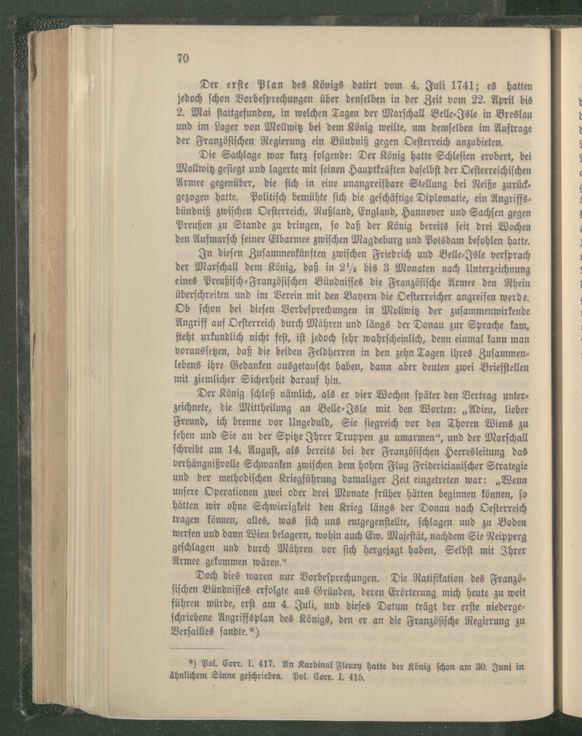 In dieſen Zuſammenkünften zwiſchen Friedrich und Belle⸗Isle verſprach der Marſchall dem König, daß in 2, bis 3 Monaten nach Unterzeichnung eines Preußiſch⸗Franzöſiſchen Bündniſſes die Franzöſiſche Armee den Rhein überſchreiten und im Verein mit den Bayern die Oeſterreicher angreifen werde. Ob ſchon bei dieſen Vorbeſprechungen in Mollwitz der zuſammenwirkende Angriff auf Oeſterreich durch Mähren und längs der Donau zur Sprache kam, ſteht urkundlich nicht feſt, iſt jedoch ſehr wahrſcheinlich, denn einmal kann man vorausſetzen, daß die beiden Feldherren in den zehn Tagen ihres Zuſammen­lebens ihre Gedanken ausgetauſcht haben, dann aber deuten zwei Brieſſtellen mit ziemlicher Sicherheit darauf hin.