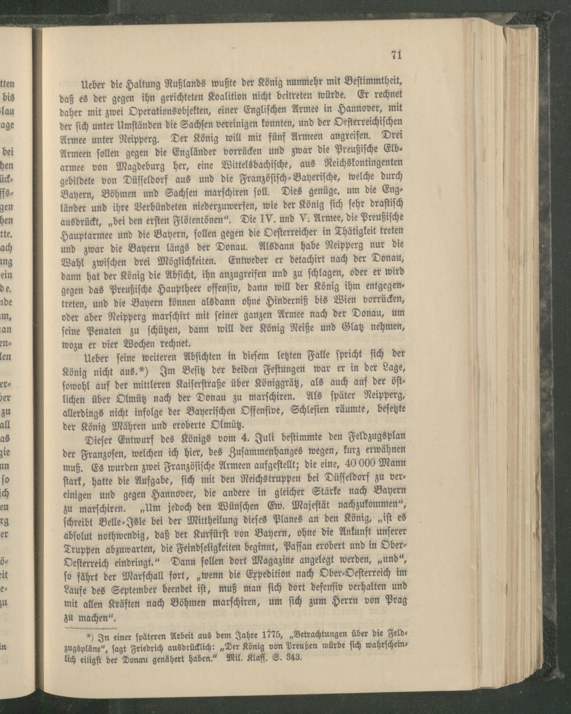 *) In einer ſpäteren Arbeit aus dem Jahre 1775,„Betrachtungen über die Feldzugspläne“, ſagt Friedrich ausdrücklich„Der König von Preußen würde ſich wahrſcheinlich eiligſt der Donau genähert haben.“ Mil. Klaſſ. S. 343.