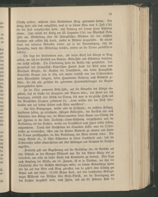 Olmütz erobert, während feine Verbündeten Prag genommen hatten. Der König hatte alſo das ausgeführt, was er in ſeinem Plan vom 4. Juli 1741 für den Fall ausgeſprochen hatte, daß Neipperg mit ſeinem Heere Schleſien räume. Jetzt erſucht der König am 23. Dezember 1741 den Marſchall Belle Isle um Mittheilung über die Franzöſiſchen Abſichten für den nächſten Sommer und erklärt ſich bereit, weiter in Mähren vorzurücken. Er nimmt ſomit den leitenden Gedanken wieder auf in der Vorausſetzung, daß die Franzoſen , durch ihre Mißerfolge belehrt, wieder an die Donau zurückkehren würden.