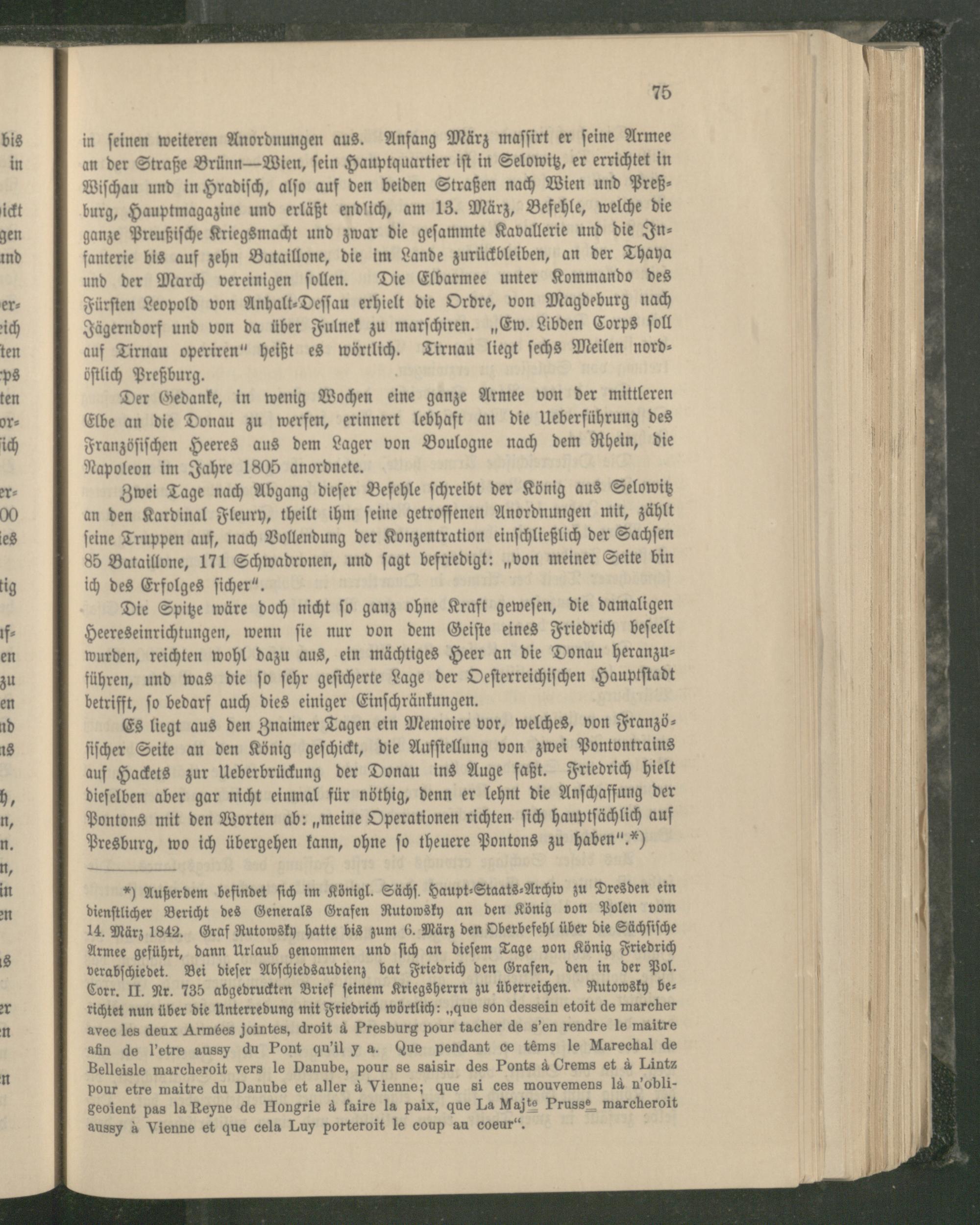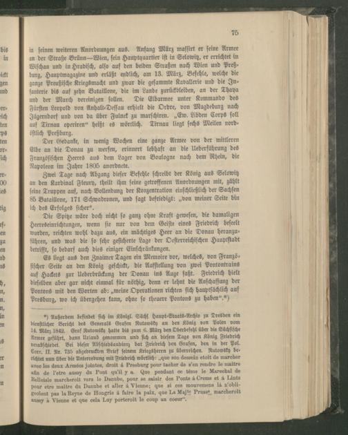 ſiſcher Seite an den König geſchickt, die Aufſtellung von zwei Pontontrains auf Hackets zur Ueberbrückung der Donau ins Auge faßt. Friedrich hielt dieſelben aber gar nicht einmal für nöthig, denn er lehnt die Anſchaffung der Pontons mit den Worten ab:„meine Operationen richten ſich hauptſächlich auf Presburg, wo ich übergehen kann, ohne ſo theuere Pontons zu haben!“.*) *) Außerdem befindet ſich im Königl. Sächſ. Haupt⸗-Staats⸗A rchiv zu Dres den ein dienſtlicher Bericht des Generals Grafen Rutowsky an den König von Polen vom 14. März 1842. Graf Rutowsky hatte bis zum 6. März den Oberbefehl über die Sächſiſche Armee geführt, dann Urlaub genommen und ſich an dieſem Tage von König Friedrich verabſchiedet. Bei dieſer Abſchiedsaudienz bat Friedrich den Grafen, den in der Pol. Corr. II. Nr. 735 abgedruckten Brief feinem Kriegsherrn zu überreichen. Rutowsky berichtet nun über die Unterredung mit Friedrich wörtlich:„que son dessein etoit de mareher avee les deux Armses jointes, droit à Presburg pour tacher de s'en rendre le maitre afin de etre aussy du Pont qu'il y a. Que pendant ce tems le Marechal de Belleisle marcheroit vers le Danube, pour se saisir des Ponts à Crems et à Lintz pour etre maitre du Danube et aller 4 Vienne; que si ces mouvemens la mobligeoient pas la Reyne de Hongrie à faire la paix, que La Majte Prusse marcheroit aussy à Vienne et que cela Luy porteroit le coup au coeur“.