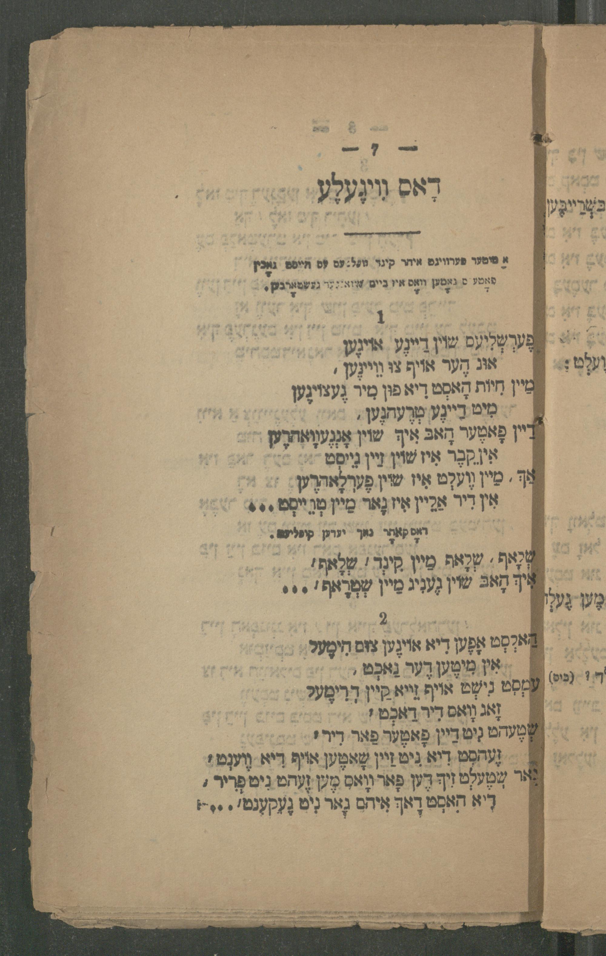 עמְסְט נִישְׁט אויף זֵייא קֵיין דְרִימֶעל- זָאג וָואס דִיר דָאכְט י} שְׁטֶעהט נִיט זַיין פָאטֶער פַאר דִיר: זֶעהסט דיא נִיט זַיין טָאטֶען אויף דיא וֶוענְט? נאר שטֶעלְט זִיךְ דֶען פַאר וָואס מֶען זֶעהט נִיט פְרִיר דיא האסְט דָאךְ אִיהם נָאר נִיט גֶעקענטי.•*