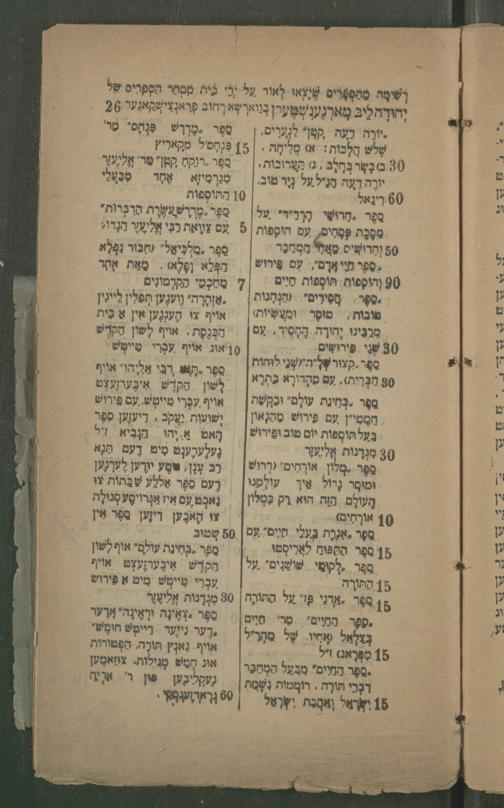 10 אוֹרְחִים) ספר אָנְרֶת בעלי חיים" עם 50 שְׁטוּב 15 סֵפֶר הַתַּפּוּחַ לַאֲרִיסְטוּ ספֶר בְּחִינַת עוֹלָם" אוף לשון ספר לקוטי שושנים" על הקדֶשׁ אִיבֶּערְזֶעצְט אויף
