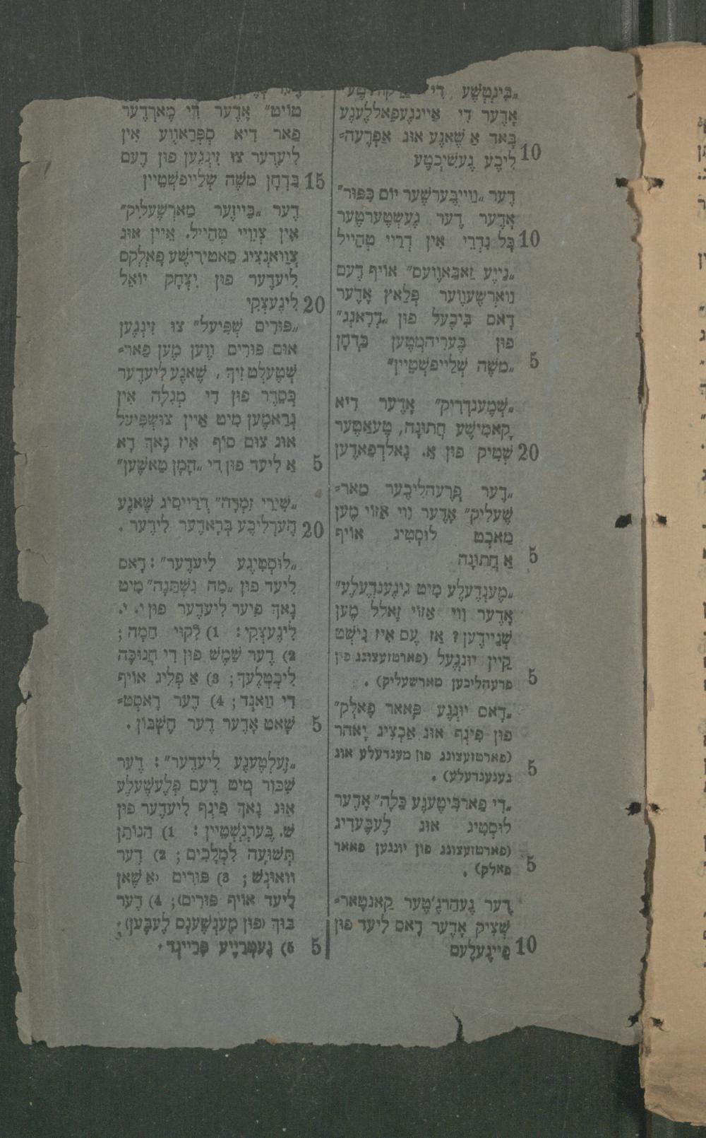 15 בִּדְחָן משֶׁה שְׁלַייפְשְׁטֵיין דֶער ווייבערשער יוֹם כִּפּוּרי דֶער בֵּייזֶער מַארְטֶעליק" אדער דֶער גֶעשְׁטֶערטער 10 כָּל נִדְרֵי אִין דְרַיי טְהֵייל אין צוויי טהייל. איין און צוואנציג סאטירישע פאלקס נייע זאבאוועס" אויף דעם ליעדער פון יִצְחָק יואל