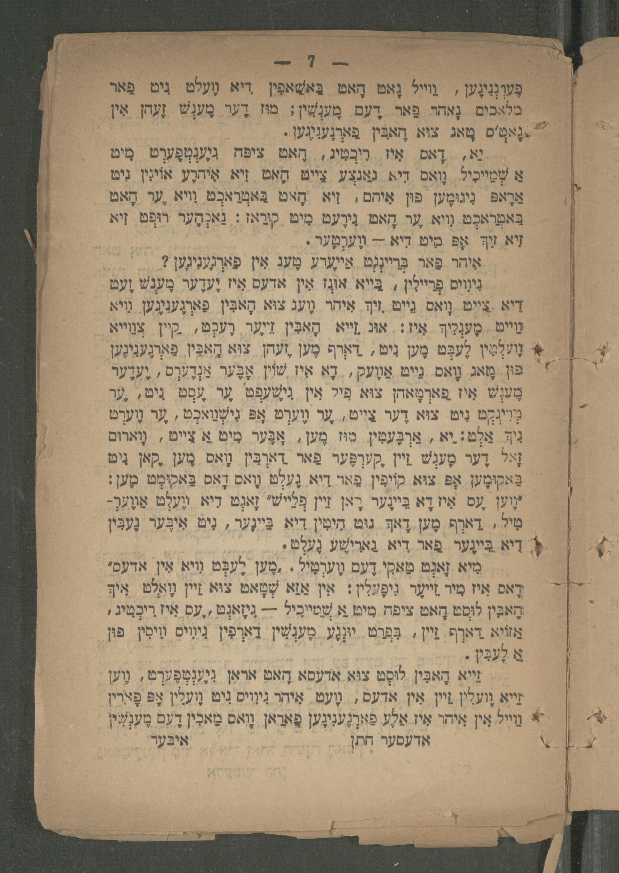פֶעגְנינֶען, גייל נָאם הָאט בַּאשַׁאפִין דיא וֶעלט נִיט פַאר. מלאכום. נָאהֹר פַּאר דֶעם מֶענְשִׁין; מוז דֶער מֶענְשׁ זע אִין *-גָאט'ס טָאג צוּא הָאבִּין פַארנֶענִינען. יא, דָאם אִיז ריִבְטִיג, הָאט ציפּה גוֶענְטְפֶערְט מִיט אַ שְׁטֵייכִיל. וָואם דִיא. גאנצע צייט הָאט זִיא אִיהרֶע אוֹינִין נִיט אַדָאפּ נִינוּמֶען פוּן אֵיהם, זיא הָאם בַּאטְרַאכְט וויא ,ער הָאט בַּאטֲרַאכְט. ער הָאט גִירֶעט מִיט קורַאז: נַאנְהֶער רוּפט זיא זיא זיךְּ אָפּ מיט דִיא-- וֶערְטֶער. אִיהר פַּאר בְּרַיינְגְט. אינֶערע טֶעג אִין פַארְגֶעגִיגֶען? ִיוִום פְרֵיילִין ,. בַּייא אוֹנָז אִין אדעס אִיז וֶעדֶער מֶענְשׁ זֶעט דיא צייט וָואס גייט זי איהר ֶועג צוּא הָאבִּין פַארְגֶענוֶען ויא ַייט. מֶעגְלִיךְ אִיז:. אוג זייא הָאבִּין זײַער רֶעכְט,. קיין צוַייא זֶועלְמִין לֶעבְּט מֶען נִיט , דארף מֶען זעהן. צוא הָאבִּין, פַארגֶענִינֶען פּון. מָאג. וָואס. גַיִם אַוֶעק ,. דָא איז שׁוֹין. אָבֶּער בַנְדֶערְס, יֶעדֶער מֶענְשׁ אִיז פַארְטָאהן צוּא פיל אין. גישעפְט ער עסְט נִיט, ,ער מְוִינְקְט:2 צוּא דֶער ציט,. ער וֶוערְט אָפּ נִישְׁוַאכְט, ער נֶוערְט גי אֶלְט: יא, אַרְבֶּעמִין טוּו מֶען, אָבֶּער מיט א צייט, וָארוּם זָאל דֶער א זיין קֶערְפֶּער פֿאר דַארְבִּין וָאס. מֶען ,קאן נִיט בַּאקוּ מֶען אָפּ צוא. קויפין. פאר דיא גֶעלְט וָואס דָאס בַּאקוּמְט מֶען; "וֶוען;עם אִיז דָא בִּינֶער דָאן זיין פְלַיישׁי זָאגְט דִיא ווֶעלְט אַוֶעךְמִיל, דַארְף. מֶען. דָאךְ. גוט הַימִין דיא בַּינֶער, נִיט אִיבֶּער נֶעבִּין - דיא בִּיינֶער. פַאר דיא גארישע גֶעלְט. מיא זָאגְט פַּאקֵי דֶעם וערְטִיל. מֶען לֶעבְּט וַויא אִין אדעסי דָאס אִיז מִיר זֵייעֶר א: אין אַזֵא שְׁטָאט צוּא זַיין ָאלְט אִיךְ הָאבִּין לוט הָאט ציפה. מיט א שְׁמייכִיל-- גִיָאגְט ,עס אִיז רִיכְמִיג, זיא וא זַיין. בִּפָרט. יונָע. מֶענְשִׁין דַארְפִין נִיוִיס תִיסִין פוּן זייא הָאבִּין לוּסֶט צוּא ארעסא הָאט אראן גִֶענְמְפֶערְט, נֶוען זייא וֶועלִין זיין אִין אדעס ,. מֶעט. אֵיהר גִיוַויס נִיט וֶועלִין צָפּ פָארִין 8 וַייל אִין איהר אִיז אַלע פֿארְגֶענִיגֶען פַארַאן וָואס מַאכִין דֶעם מֶענְשִׁין אדעסער חתן איבּער