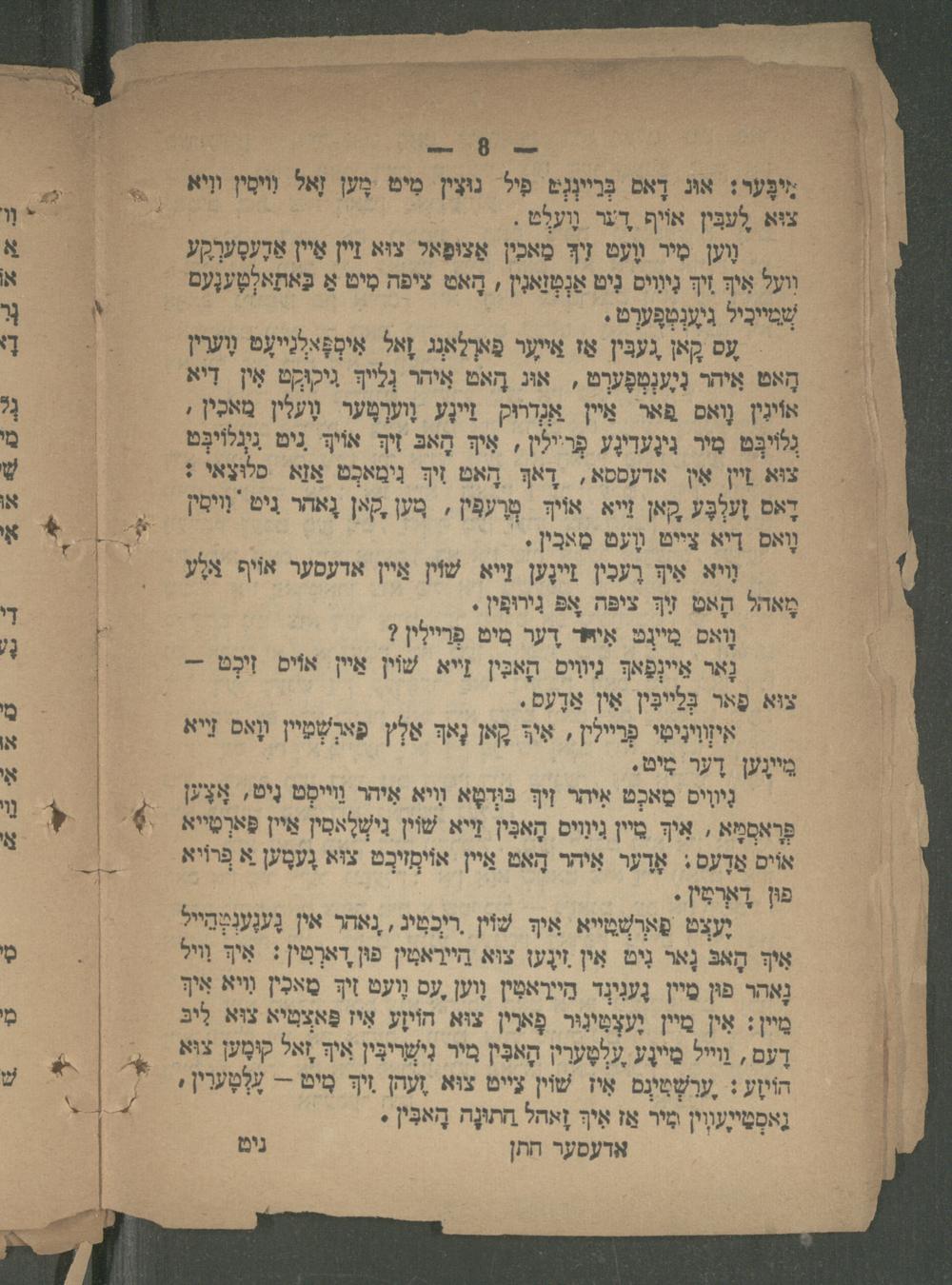וֶוען מִיר װֶעט זִיךָּ מַאכין אַצוּפָּאל צוּא זַיין אֵיין אַדֶעסֶערְקֶע על אִיךְ זִיךְ גִיוִוִים נִיט אַנְמְזַאנִין, הָאט ציפה מִיט אַ בַּאתַאלְט ענֶעם. שְׁמייכִיל גִעֶנְטְפֶערְט. עס הָאן געבּין אַז איער פַארְלַאנְג זָאל אִימְפָאלְֵייעְט נֶערִין הָאט אִיהר נִיֶענְמְפֶּערְט, אוּג הָאט אִיהר נְלייךְּ גיקוקט אִין דִיא ו אוֹינִין נָואס פַאר= אגדרוק זַיינֶע וֶוערְטֶער וֶעלִין מאכין, גְלוֹיפֶּט מיר גִינֶעדִינֶע פְריילִין, אִיךְ הָאבּ זִיךְ. אוֹיךְּ נים גִיְלוֹיבְּט צוּא זַיין אִין אדעססא, דָאךְ הָאט זִיךְּ נִימַאכְט אַזַּא סלוּצאי: דָאס זֶעלְבֶּע קָאן זייא אויך מען ,קאן נָאהר נִיט וסִין וָואס דיא צייט מֶעט מַאבִין. ויא אִי רֶעכִין זיינֶען זייא שׁוֹין אֵיין ארעסער אוֹיף אֶלֶע מָאהל הָאט זיךְּ ציפה אפּ גִירוּפִין. וָואס מֵיינְט אִיויד דֶער מיט פְרַיילִין? נָאַר אֵיינְפָאךְּ גיוויס קָאבִּין זייא שׁוין אֵיין אוֹים זִיכְט= צוּא פַאר בְּלַיבִּין אִין אַדֶעם. וימי פריילן, איף קָאן נָאךְ אַלֶץ פארשְפיין וָאס ליא מִיֶען דער מִיט.