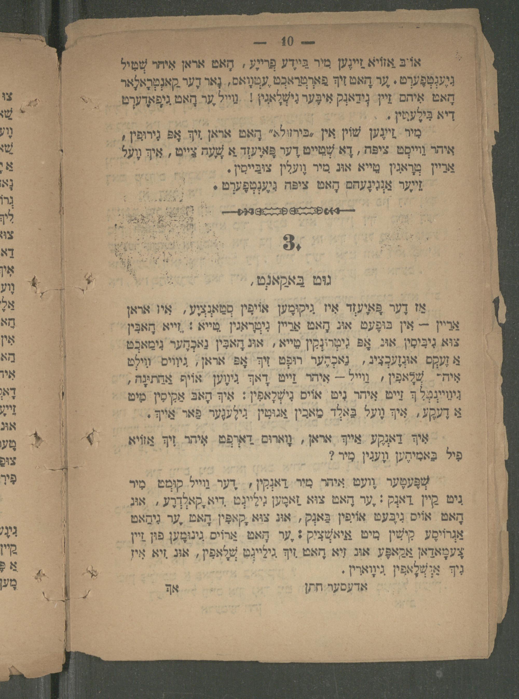 אַז דֶער פָּאוֶעזְד אִיז גִיקוּמֶען אוֹיפִּין סְמַאנְציִע, איז אראן אריין-=- אין בּוּפֶעט אוּנ הָא אַבײן נִיְמָרָאגִין מַייא+;זייא הָאבִּין צוּא גִיבִּימִן אוג. אָפּ גִיטְרּנְקֵין טַייא, אוּג הָאבִּין נַאכְּהֶער נִימאכְט א זֶעקֶם אוּנְזֶעכְצִיג,. נַאכְקֶער רוּפָט זִיךְ אָפּ' אראן, ניווים ייט אִיח-. שְׁלָאפִין, וַוייל-- אִיהר זַייט דָאךְ גִיוֶוען' אוֹיף אַחתעָה, גִיוֵיעְכּל ך זַייט אֵיהר נִיט| אוֹים נִישְׁלַאפִין אִיךְ הָאבּ אַקִיסִין מִים א דֶעקֶע, איך וֶעל בַּאלְד מאכין אַגוּמין ִילֶענֶער' פַאר אַוֹיךְ,