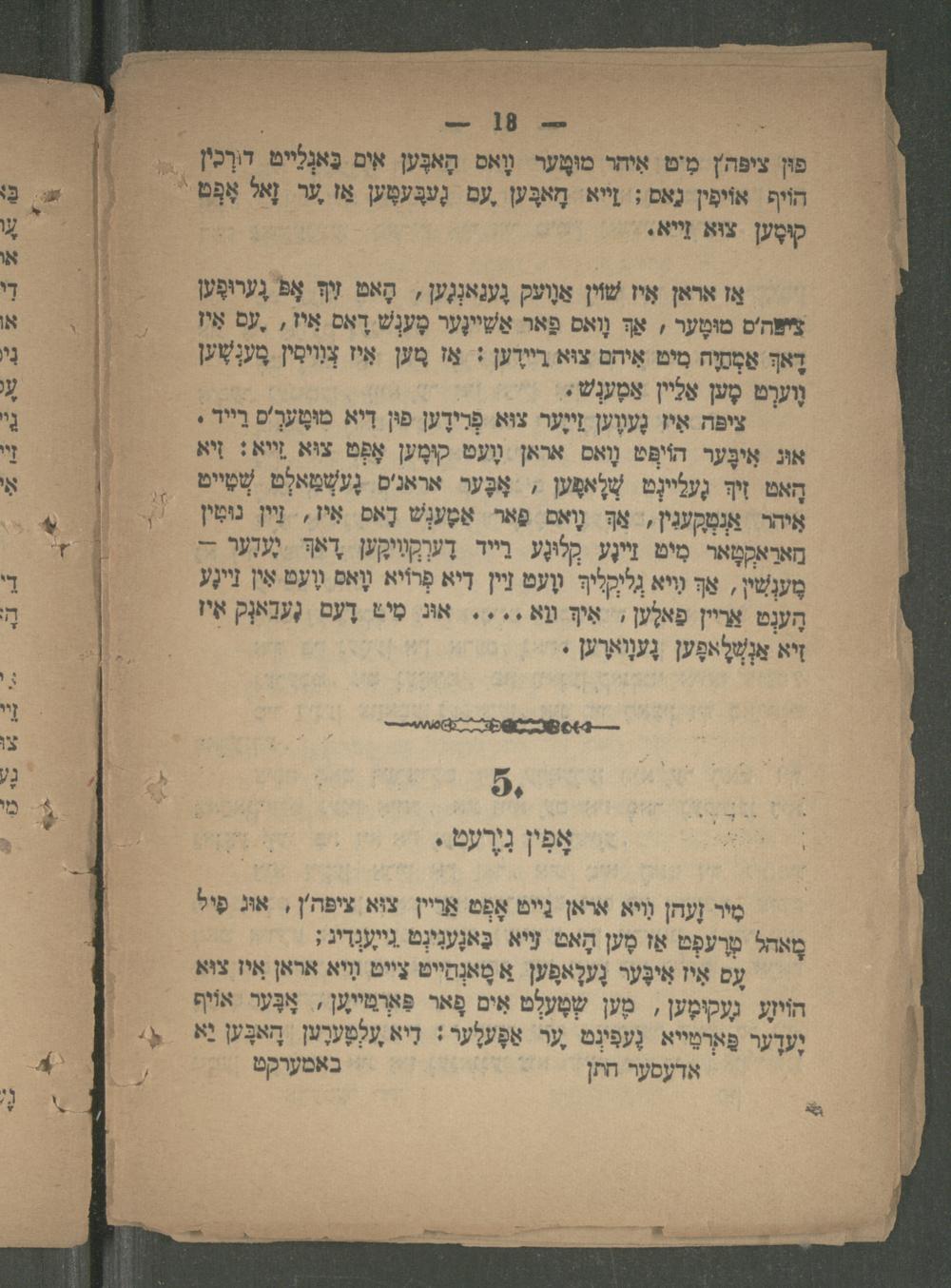 הוֹים אוֹיפִין נָאס; זַייא' חָאבֶּען עם גֶעבֶּעטֶען אַז ער זָאל אָפֶּט*. קוּמֶען צוא זַייא. אַז אראן אִיז שׁוֹין אַוֶועק גֶענַאנְגֶען, הָאט זִיךְ אָפ גֶערוּפֶען צישה'ם מוּמֶער, אַך וָואס פַאר אַשֵׁיינֶּער מֶענְשׁ דָאס אִיז,.עס אִיז*ן דָאךְּ אַמְחַיָה מיט אֵיהם צוּא ריידען: אַז מֶען אִיז צְוִויִין מֶענְשֶׁען וֶוערְט מֶען אַלַין אַסֶענְשׁ; ציפה אִיז גֶעוֶען זײיער צוּא פְרִידֶען פון דיא מוּטֶעךְ'ס רַייד. אוּג אִיבֶּער הוֹמְּט וָואס אראן וֶעט קוּמֶען אָפְּט צוּא זַייא: זִיא הָאט זִיךְּ גֶעֵיינְט שְׁלָאמֶען,- אָבֶּער אראנ'ס גֶעשְׁמַאגְט שְׁמִייט.= א אנְטְקֶעגִין,. אַךְּ וָואס פַאר אַמֶענְשׁ דָאס אִיז, וֵייןו מַארָאקְטָאר מִים זיינֶע קְלוּנֶע רייר דֶערקוויקֶען דאר גֶעדֶער-= מֶענְשִׁין, אַך ויא גִלקְלִיךּ װֶעט זיין דיא פְרוֹיא וָאס וֶועט אִין זַיינֶע הֶענְט אריין פאלען, אי װֵא.... אוּג מִיט דֶעם גֶעדַאגְק אִיז מִיר זֶעהן ויא אראן. נייט אָפֶט אַריין צוא ציפה'ן, אוּג פָּיל מָאל מְרֶעפְט אַז מֶען הָאט זייא בַּאגֶענִינְט גִיענְדיג; עִם אִיז אִיבֶּער גֶעלָאפֶען. א טַּאנְחַיט צייט יא אראן איז צוּא הו גֶעקומֶען, מֶען שֶׁעְט אִים פָאר פארמען, אָבּער אוֹף יֶעדֶער פַּארטַייא נֶעפִעְט ,ער אַפֶּעלֶער; דִיא עלְמֶערֶען הָאבֶּען יא אדעסער חתן באטערקט