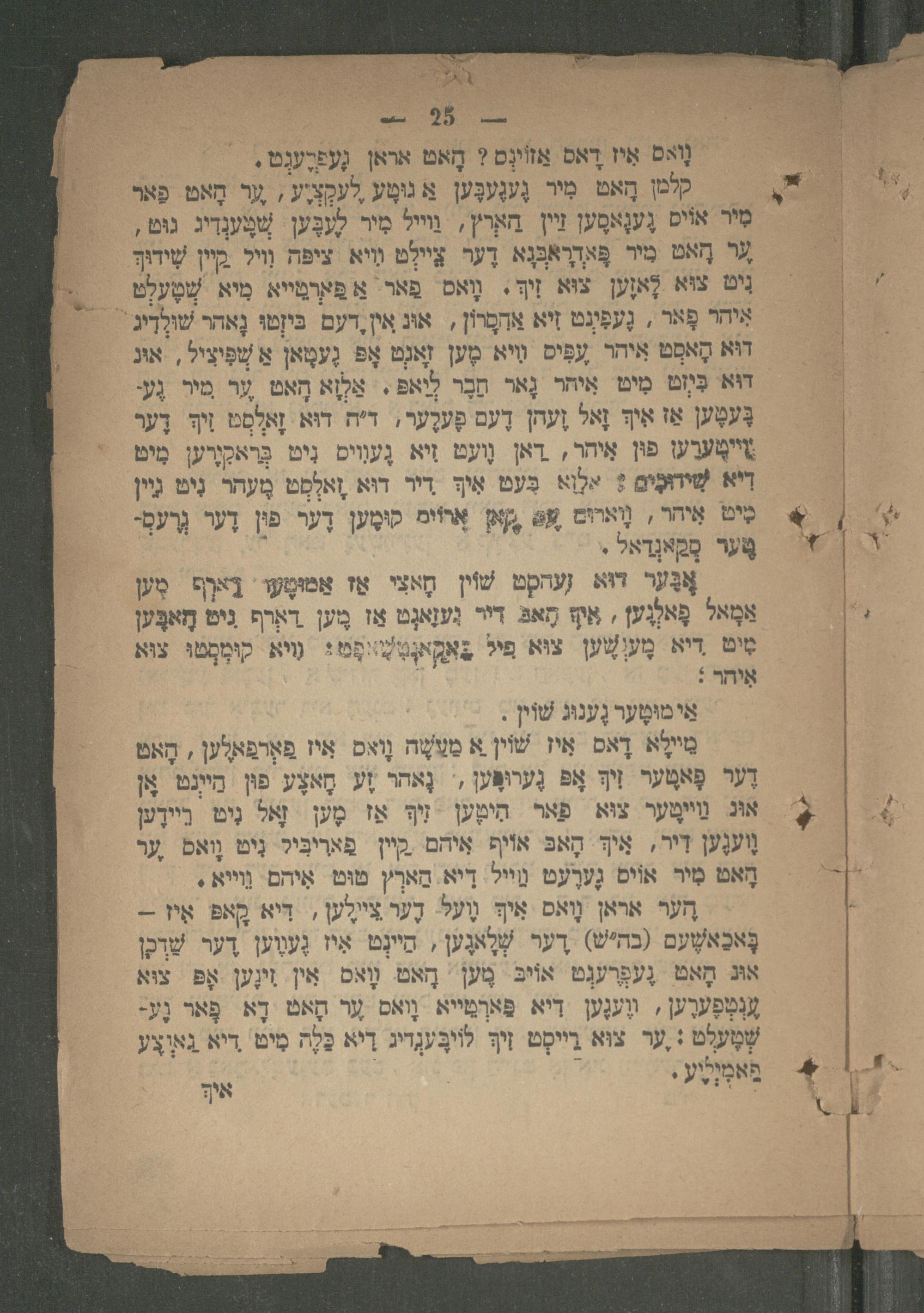 קלטן הָאט מִיר גֶענֶעבֶּען א גוּטֶע לֶעקְצְיֶע,;ער הָאט. פאר מִיר אויס גֶענָאמֶען זַיין הארץ,- וייל מִיר לֶעבֶּען שְׁטֶענְדִיג גוּט, ער הָאט מיר פָּאדדאבְנא דֶער צֵיילְט מִיא ציפּה וֵויל קיין שִׁידוּךָ נִיט צוא לָאזֶען צוּא זִיךְ. מָאס פַאר אַ פארמײא מִיא שְׁטֶעלְט אִיהר פָאר, גֶעפִּתְט זִיא אדמָרוֹן, אוּג אין,דעם בִּיזְטוּ נָאהר שׁולְדִיג דוּא הָאפְט איחר עִפִּים ויא מֶען זָאגְט אָפּ גֶעמָאן אַשְׁפִּיצִיל, אונ דוּא בִּיָט מִיט איהר גָאר חֵבֶר לואפ| אַלְזָא הָאט ער מיר גֶען גֶּעטֶען אַז איך זָאל זֶעחן דֶעם פֶערֶער, דיה דוּא זָאלְסט זִיך דֶער צֵיימֶערֶען פון אִיחר, דאן וֶועט זִיא גֶעוִוִים נִיט בְּראקוֶרֶען מִיט דִיא שִׁידוּצִים? אלָוָא פֶעט אִיךְּ דיר דוּא זָאלְסְט מֶעהר נִיט גיין טִיט אִיחר, נָוארוּם 8 קָאן אֲרוֹים קוּמֶען דֶער פוּן דֶער גֶרֶעסְמֶער פָקַאגָאל.