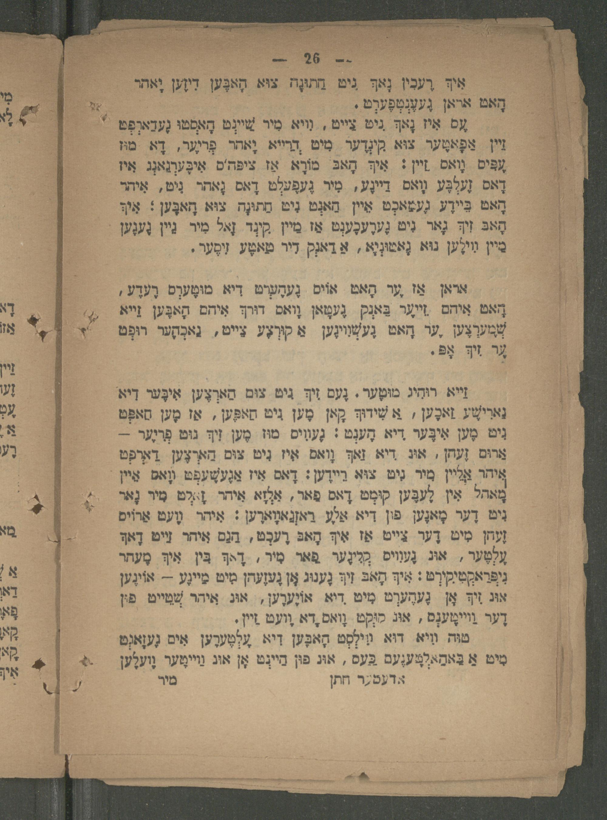 מָאהל אִין לֶעבֶּען קוּמְט דָאס פַאר, אַלְזָא אִיהר ז!יֶכְט מִּיר נָאר נִיט דֶער מָאנֶען פון דִיא אַלע רַאזְנַאוָארֶען: אִיהר וֶעט אַרוֹים זֶעחן סִיט דֶער צייט אַז אִיךְ הָאכּ רֶעכְט, הַנַם איהר זײַט דָאךְ עֲלְטֶּער, אוּג גֶענִויס גְלִינֶער פאר מִיר, דָאךְ בִּין אִיךְּ סֶעהר גיפְּרַאקְטִיקירְט: אִיךְ קָאבּ זי נֶענוּג אָן גֶעזֶעהן מִיט מֵיינָע-- אוֹינֶען אוג זִיךְ אָן גֶעהֶערְט מִים דיא אוֹיֶערֶען, אוּג איהר שְׁמַייט פוּן דֶער גֵויימֶעגְם, אוג קוקט וָואס;דא וֶועט זַיין.