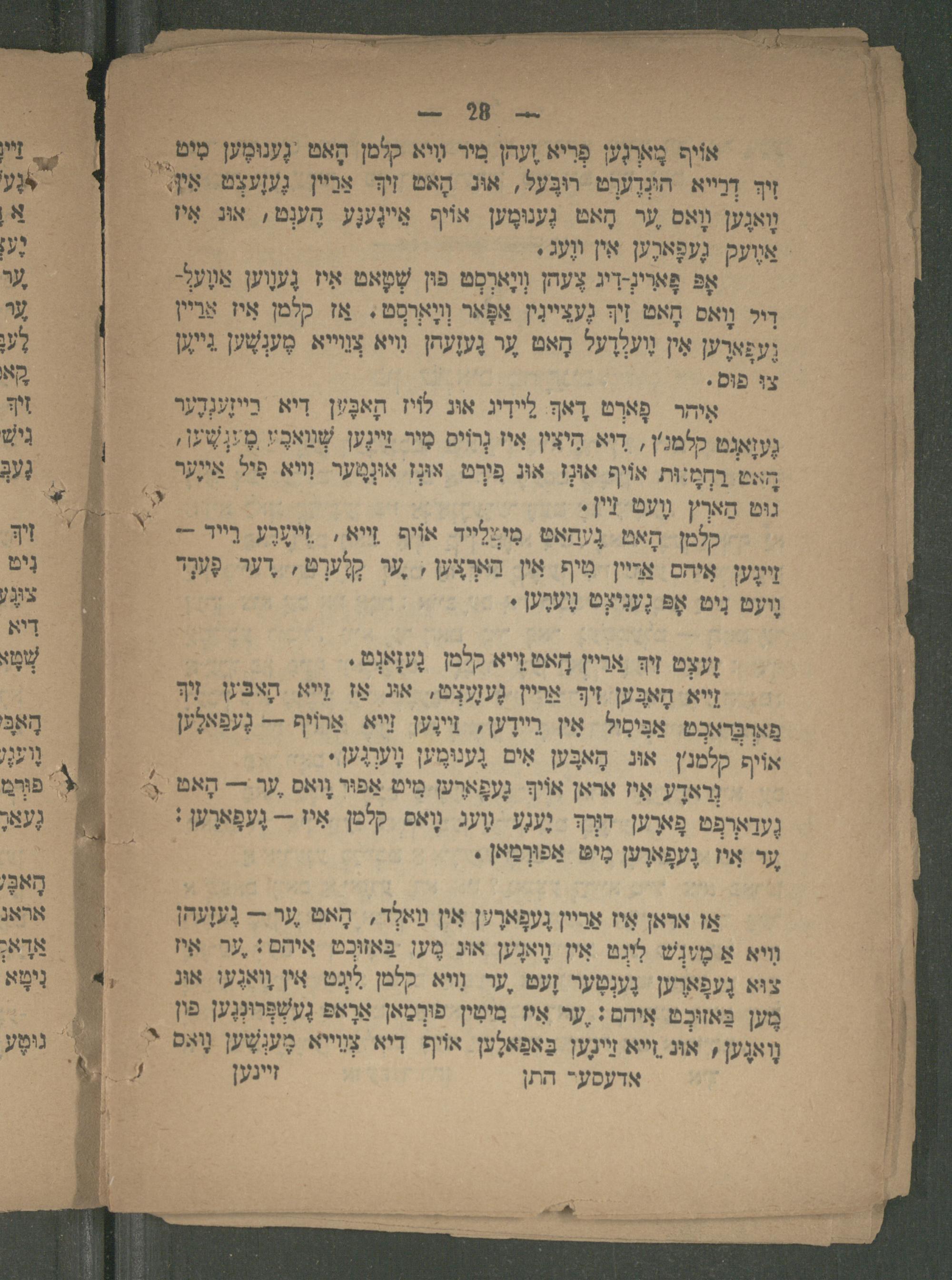 אָפּ פָאִי-דִג צֶעהן וָארְסְט פון שׁמָאט אִיז גֶעוֶוען אַװֶעלְ-| דִיל וָואס הָאט זִיךְ גֶעציינִין אפָּאר וְוָארסְט. אז קלמן אִיז אַרַיין ֶעפַארֶען אִין ֶועלרֶעל הָאט עֶר גֶעֶען ווא צְווייא. מֶענְשֶׁען יי צוּ פוּס.
