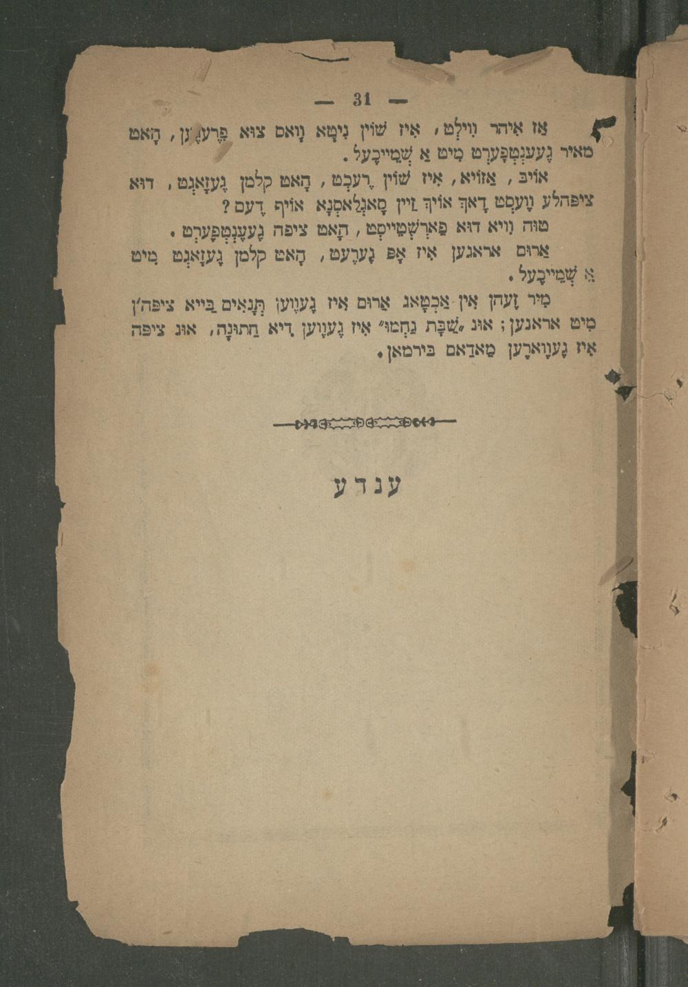 אַז אֵיהר וִילְט, אִיז שׁוֹין נִיטָא נָואס צוא פַרעןען, הָאט טאור גֶעענְטְפֶּערְט מִיט א שְׁטֵייכֶעל. אויבּ, אַזוֹיא, אִיז שֹׁין רעכְט, הָאט קלמן גֶעזָאגְט, דוא ציפהלע וֶעסְט דָאךְ אוֹיך זיין מָּאנְלַאסְנא. דעם? טוה נויא דוּא פַארְשְׁטֵייסְט, קָאט ציפה גֶעעֶנְמְפֶּערְט. אַרוּם אראגען אִיז אָפּ גֶערֶעט, הָאט קלטן גֶעזָאגְט מיט א שְׁמַייבֶעל. מִיר זֶעחן אין אַכְטָּאג אַרוּם איז גֶעוֶוען תָּנִאִים בַּייא ציפּה'ץ מִיט אראנען; אוּג ִשׁבָּת גַחְמוּי אִיז גֶעוֶוען דיא חַוּנָה, אוּג ציפה אִיז גֶעוָוארֶען מַאדַאם בּירטאן,