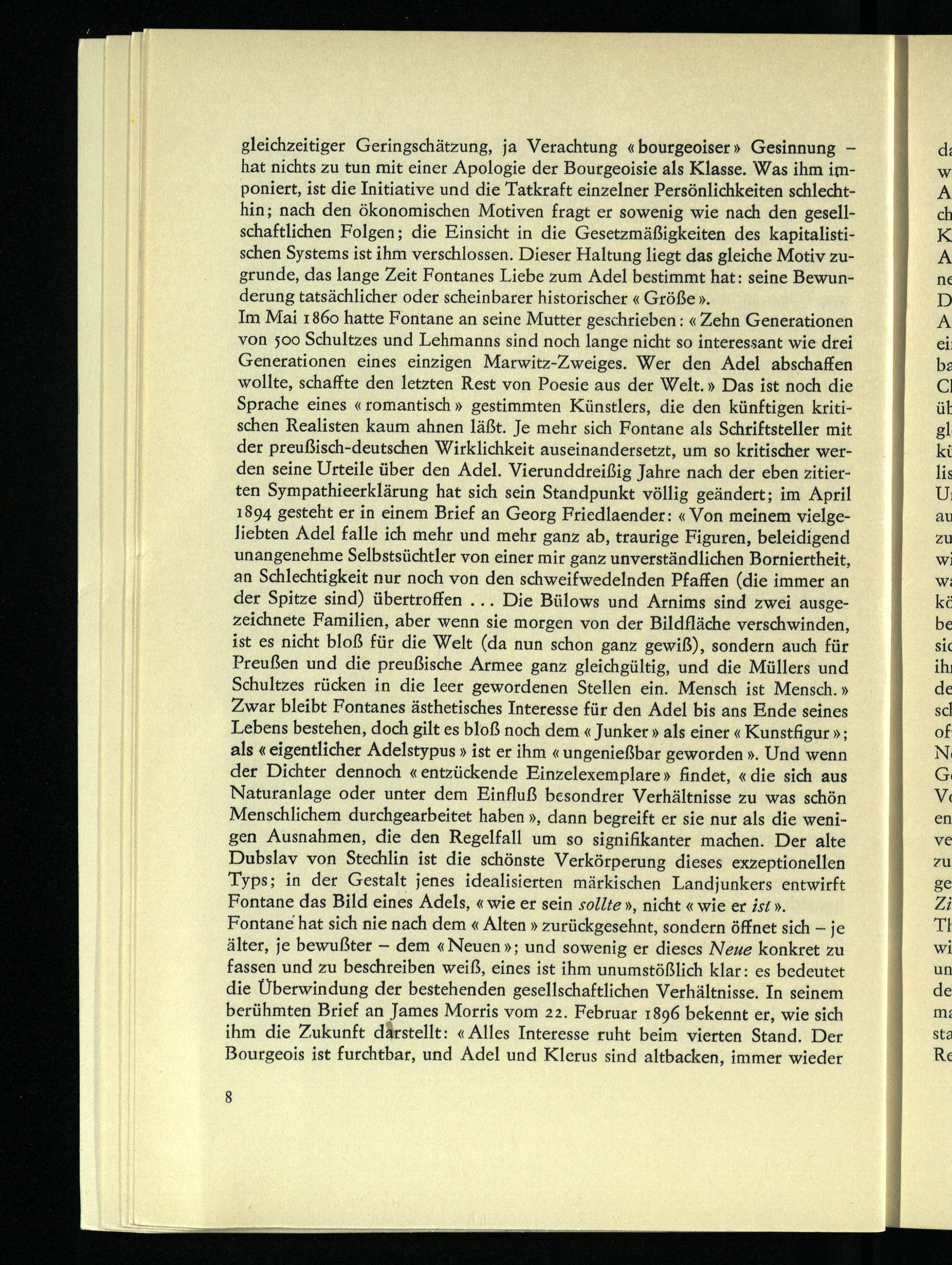 Im Mai 1860 hatte Fontane an seine Mutter geschrieben: « Zehn Generationen von 500 Schultzes und Lehmanns sind noch lange nicht so interessant wie drei Generationen eines einzigen Marwitz-Zweiges. Wer den Adel abschaffen wollte, schaffte den letzten Rest von Poesie aus der Welt.» Das ist noch die Sprache eines « romantisch » gestimmten Künstlers, die den künftigen kritischen Realisten kaum ahnen läßt. Je mehr sich Fontane als Schriftsteller mit der preußisch-deutschen Wirklichkeit auseinandersetzt, um so kritischer werden seine Urteile über den Adel. Vierunddreißig Jahre nach der eben zitierten Sympathieerklärung hat sich sein Standpunkt völlig geändert; im April 1894 gesteht er in einem Brief an Georg Friedlaender: «Von meinem vielgeliebten Adel falle ich mehr und mehr ganz ab, traurige Figuren, beleidigend unangenehme Selbstsiichtler von einer mir ganz unverständlichen Borniertheit, an Schlechtigkeit nur noch von den schweifwedelnden Pfaffen (die immer an der Spitze sind) übertroffen ... Die Biilows und Arnims sind zwei ausgezeichnete Familien, aber wenn sie morgen von der Bildfläche verschwinden, ist es nicht bloß für die Welt (da nun schon ganz gewiß), sondern auch für Preußen und die preußische Armee ganz gleichgültig, und die Müllers und Schultzes rücken in die leer gewordenen Stellen ein. Mensch ist Mensch.» Zwar bleibt Fontanes ästhetisches Interesse für den Adel bis ans Ende seines Lebens bestehen, doch gilt es bloß noch dem « Junker » als einer « Kunstfigur »; als « eigentlicher Adelstypus » ist er ihm « ungenießbar geworden ». Und wenn der Dichter dennoch « entzückende Einzelexemplare» findet, « die sich aus Naturanlage oder unter dem Einfluß besondrer Verhältnisse zu was schön Menschlichem durchgearbeitet haben », dann begreift er sie nur als die wenigen Ausnahmen, die den Regelfall um so signifikanter machen. Der alte Dubslav von Stechlin ist die schönste Verkörperung dieses exzeptionellen Typs; in der Gestalt jenes idealisierten märkischen Landjunkers entwirft Fontane das Bild eines Adels, « wie er sein sollte », nicht « wie er ist ». Fontane hat sich nie nach dem « Alten » zurückgesehnt, sondern öffnet sich - je älter, je bewußter - dem «Neuen»; und sowenig er dieses "Neue konkret zu fassen und zu beschreiben weiß, eines ist ihm unumstößlich klar: es bedeutet die Überwindung der bestehenden gesellschaftlichen Verhältnisse. In seinem berühmten Brief an James Morris vom 22. Februar 1896 bekennt er, wie sich ihm die Zukunft därstellt: «Alles Interesse ruht beim vierten Stand. Der Bourgeois ist furchtbar, und Adel und Klerus sind altbacken, immer wieder