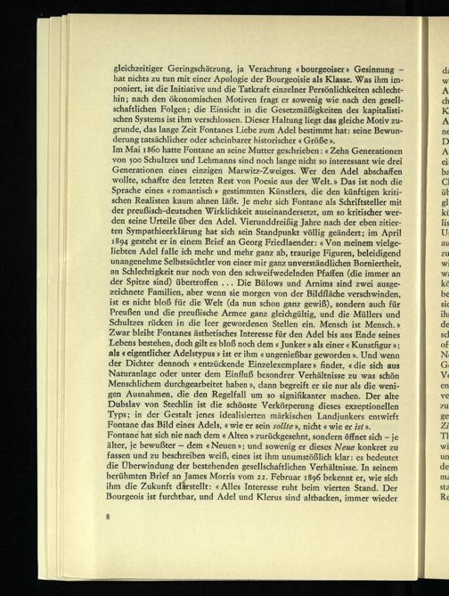 gleichzeitiger Geringschätzung, ja Verachtung «bourgeoiser» Gesinnung - hat nichts zu tun mit einer Apologie der Bourgeoisie als Klasse. Was ihm imponiert, ist die Initiative und die Tatkraft einzelner Persönlichkeiten schlechthin; nach den ökonomischen Motiven fragt er sowenig wie nach den gesellschaftlichen Folgen; die Einsicht in die Gesetzmäßigkeiten des kapitalistischen Systems ist ihm verschlossen. Dieser Haltung liegt das gleiche Motiv zugrunde, das lange Zeit Fontanes Liebe zum Adel bestimmt hat: seine Bewunderung tatsächlicher oder scheinbarer historischer « Größe ».