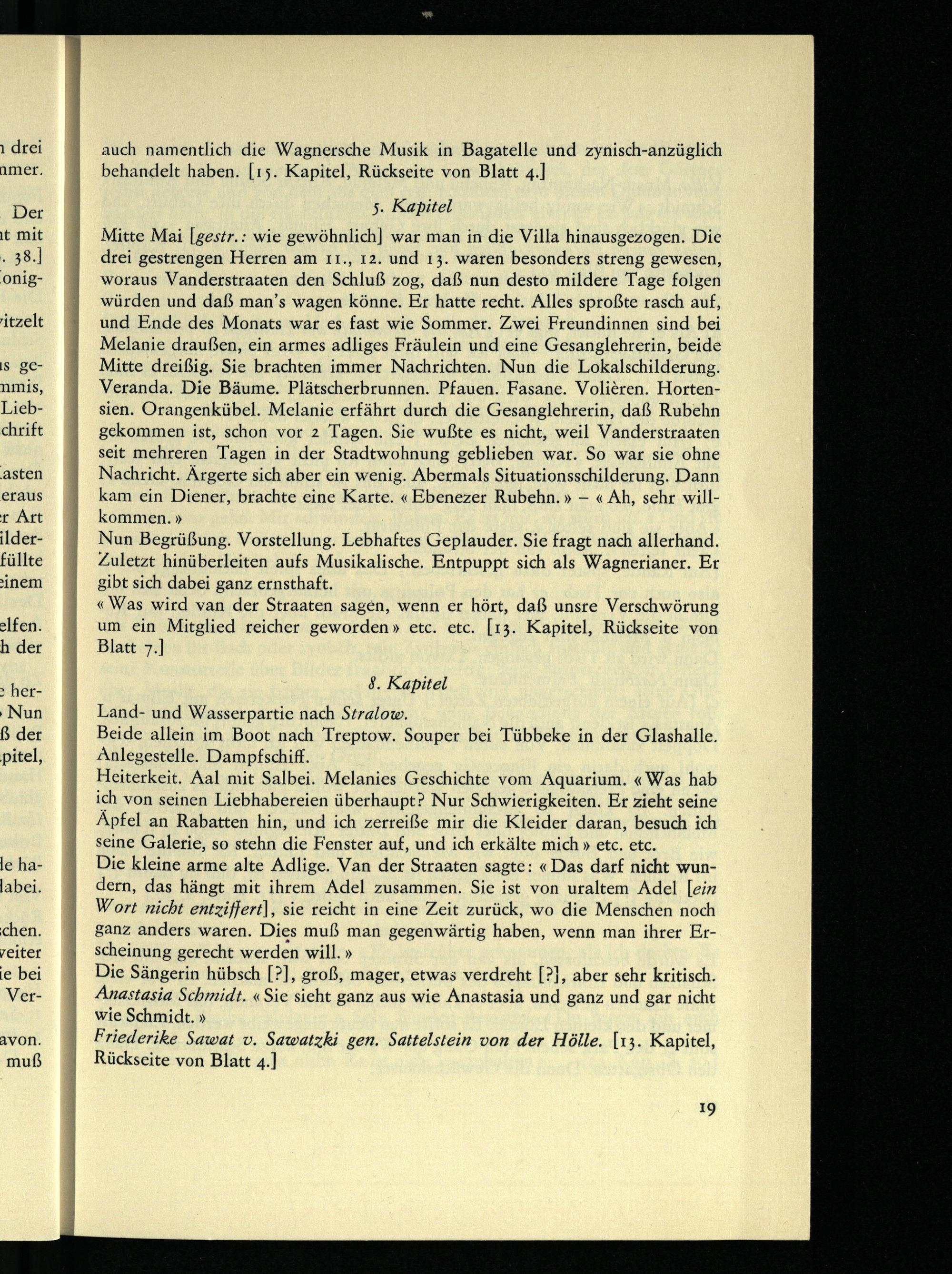 Mitte Mai [ gestr. : wie gewöhnlich] war man in die Villa hinausgezogen. Die drei gestrengen Herren am 11., 12. und 13. waren besonders streng gewesen, woraus Vanderstraaten den Schluß zog, daß nun desto mildere Tage folgen würden und daß man’s wagen könne. Er hatte recht. Alles sproßte rasch auf, und Ende des Monats war es fast wie Sommer. Zwei Freundinnen sind bei Melanie draußen, ein armes adliges Fräulein und eine Gesanglehrerin, beide Mitte dreißig. Sie brachten immer Nachrichten. Nun die Lokalschilderung. Veranda. Die Bäume. Plätscherbrunnen. Pfauen. Fasane. Volieren. Hortensien. Orangenkübel. Melanie erfährt durch die Gesanglehrerin, daß Rubehn gekommen ist, schon vor 2 Tagen. Sie wußte es nicht, weil Vanderstraaten seit mehreren Tagen in der Stadtwohnung geblieben war. So war sie ohne Nachricht. Ärgerte sich aber ein wenig. Abermals Situationsschilderung. Dann kam ein Diener, brachte eine Karte. « Ebenezer Rubehn.» - « Ah, sehr willkommen. »