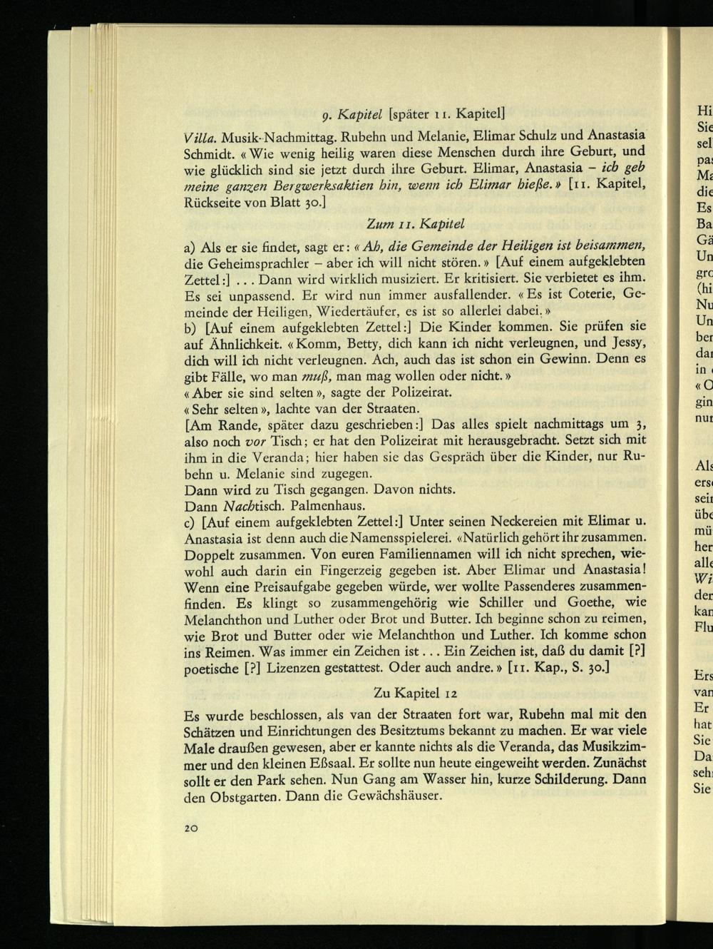 c) [Auf einem aufgeklebten Zettel:] Unter seinen Neckereien mit Elimar u. Anastasia ist denn auch die Namensspielerei. «Natürlich gehört ihr zusammen. Doppelt zusammen. Von euren Familiennamen will ich nicht sprechen, wiewohl auch darin ein Fingerzeig gegeben ist. Aber Elimar und Anastasia! Wenn eine Preisaufgabe gegeben würde, wer wollte Passenderes zusammenfinden. Es klingt so zusammengehörig wie Schiller und Goethe, wie Melanchthon und Luther oder Brot und Butter. Ich beginne schon zu reimen, wie Brot und Butter oder wie Melanchthon und Luther. Ich komme schon ins Reimen. Was immer ein Zeichen ist... Ein Zeichen ist, daß du damit [?] poetische [?] Lizenzen gestattest. Oder auch andre.» [n. Kap., S. 30.]