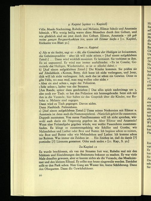 a) Als er sie findet, sagt er: « Ah, die Gemeinde der Heiligen ist beisammen, die Geheimsprachler - aber ich will nicht stören.» [Auf einem aufgeklebten Zettel:] .. . Dann wird wirklich musiziert. Er kritisiert. Sie verbietet es ihm. Es sei unpassend. Er wird nun immer ausfallender. « Es ist Coterie, Gemeinde der Heiligen, Wiedertäufer, es ist so allerlei dabei.»