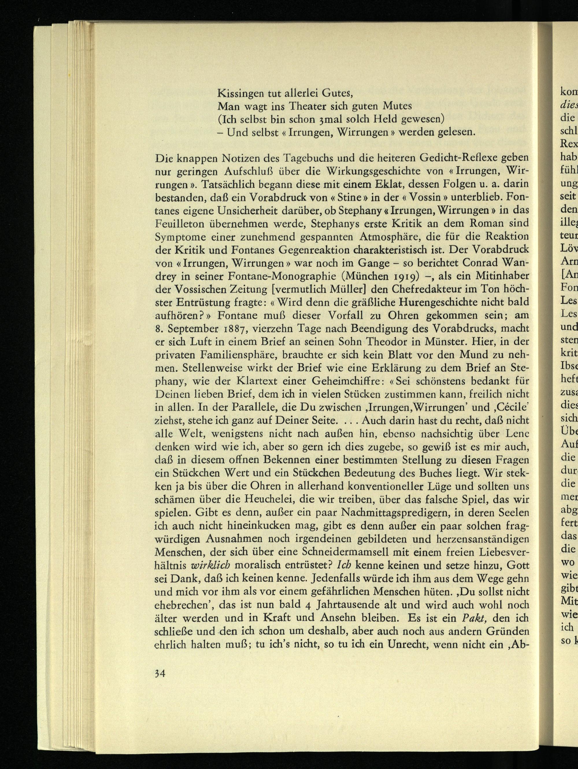 Die knappen Notizen des Tagebuchs und die heiteren Gedicht-Reflexe geben nur geringen Aufschluß über die Wirkungsgeschichte von «Irrungen, Wirrungen ». Tatsächlich begann diese mit einem Eklat, dessen Folgen u. a. darin bestanden, daß ein Vorabdruck von « Stine » in der « Vossin » unterblieb. Fontanes eigene Unsicherheit darüber, ob Stephany «Irrungen, Wirrungen » in das Feuilleton übernehmen werde, Stephanys erste Kritik an dem Roman sind Symptome einer zunehmend gespannten Atmosphäre, die für die Reaktion der Kritik und Fontanes Gegenreaktion charakteristisch ist. Der Vorabdruck von «Irrungen, Wirrungen» war noch im Gange - so berichtet Conrad Wan- drey in seiner Fontane-Monographie (München 1919) -, als ein Mitinhaber der Vossischen Zeitung [vermutlich Müller] den Chefredakteur im Ton höchster Entrüstung fragte: « Wird denn die gräßliche Hurengeschichte nicht bald aufhören?» Fontane muß dieser Vorfall zu Ohren gekommen sein; am 8. September 1887, vierzehn Tage nach Beendigung des Vorabdrucks, macht er sich Luft in einem Brief an seinen Sohn Theodor in Münster. Hier, in der privaten Familiensphäre, brauchte er sich kein Blatt vor den Mund zu nehmen. Stellenweise wirkt der Brief wie eine Erklärung zu dem Brief an Stephany, wie der Klartext einer Geheimchiffre: «Sei schönstens bedankt für Deinen lieben Brief, dem ich in vielen Stücken zustimmen kann, freilich nicht in allen. In der Parallele, die Du zwischen ,Irrungen,Wirrungen’ und ,Cecile’ ziehst, stehe ich ganz auf Deiner Seite. .. . Auch darin hast du recht, daß nicht alle Welt, wenigstens nicht nach außen hin, ebenso nachsichtig über Lene denken wird wie ich, aber so gern ich dies zugebe, so gewiß ist es mir auch, daß in diesem offnen Bekennen einer bestimmten Stellung zu diesen Fragen ein Stückchen Wert und ein Stückchen Bedeutung des Buches liegt. Wir stek- ken ja bis über die Ohren in allerhand konventioneller Lüge und sollten uns schämen über die Heuchelei, die wir treiben, über das falsche Spiel, das wir spielen. Gibt es denn, außer ein paar Nachmittagspredigern, in deren Seelen ich auch nicht hineinkucken mag, gibt es denn außer ein paar solchen fragwürdigen Ausnahmen noch irgendeinen gebildeten und herzensanständigen Menschen, der sich über eine Schneidermamsell mit einem freien Liebesverhältnis wirklich moralisch entrüstet? Ich kenne keinen und setze hinzu, Gott sei Dank, daß ich keinen kenne. Jedenfalls würde ich ihm aus dem Wege gehn und mich vor ihm als vor einem gefährlichen Menschen hüten. ,Du sollst nicht ehebrechen’, das ist nun bald 4 Jahrtausende alt und wird auch wohl noch älter werden und in Kraft und Ansehn bleiben. Es ist ein Pakt, den ich schließe und den ich schon um deshalb, aber auch noch aus andern Gründen ehrlich halten muß; tu ich’s nicht, so tu ich ein Unrecht, wenn nicht ein ,Ab-